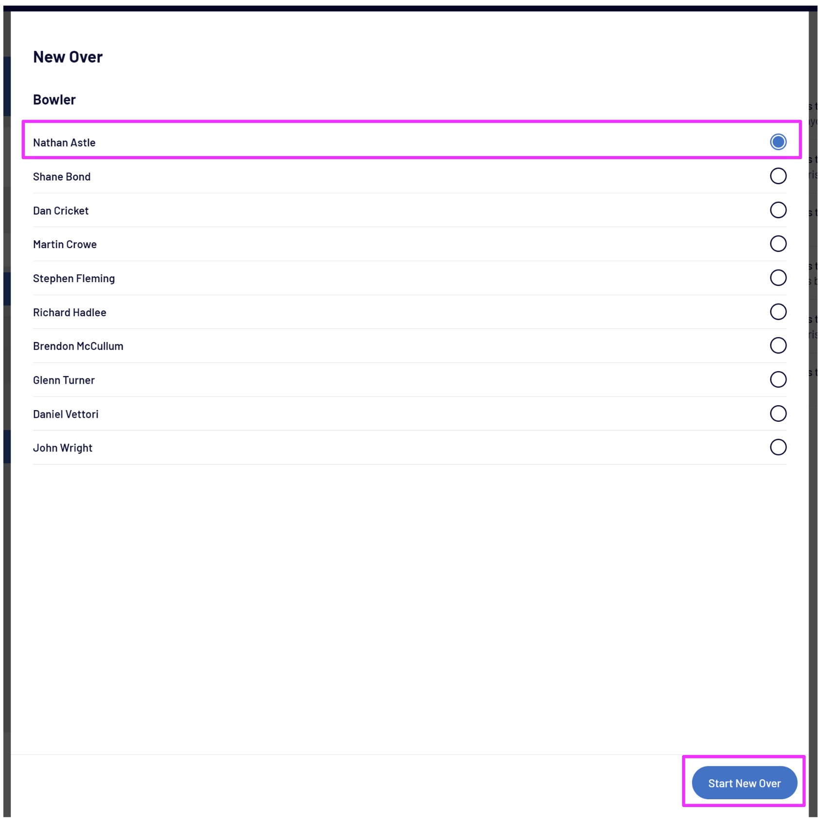 Select the New Bowler then Start New Over to commence the over:
