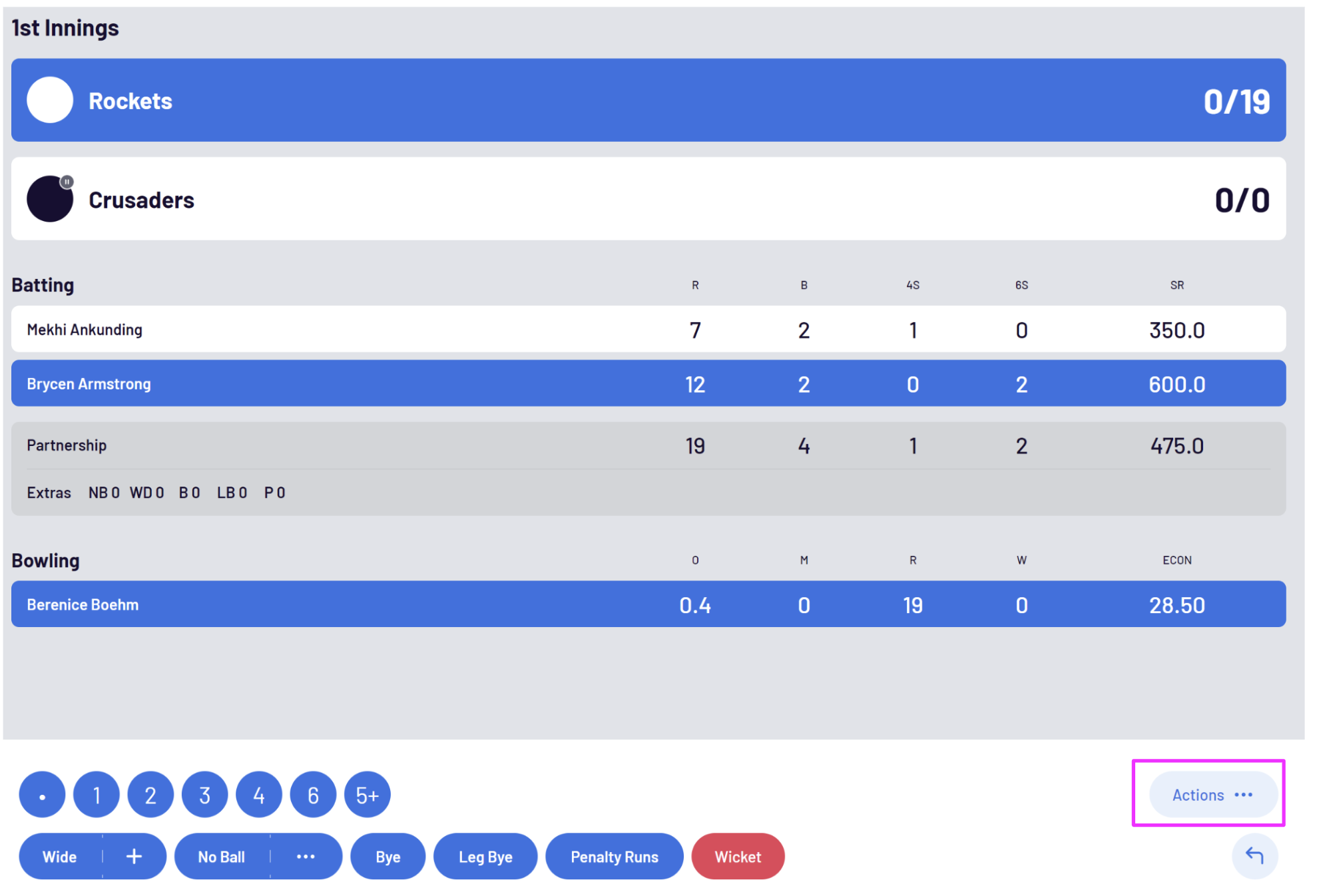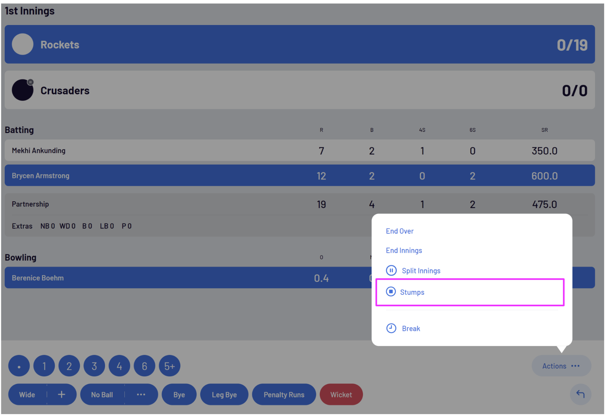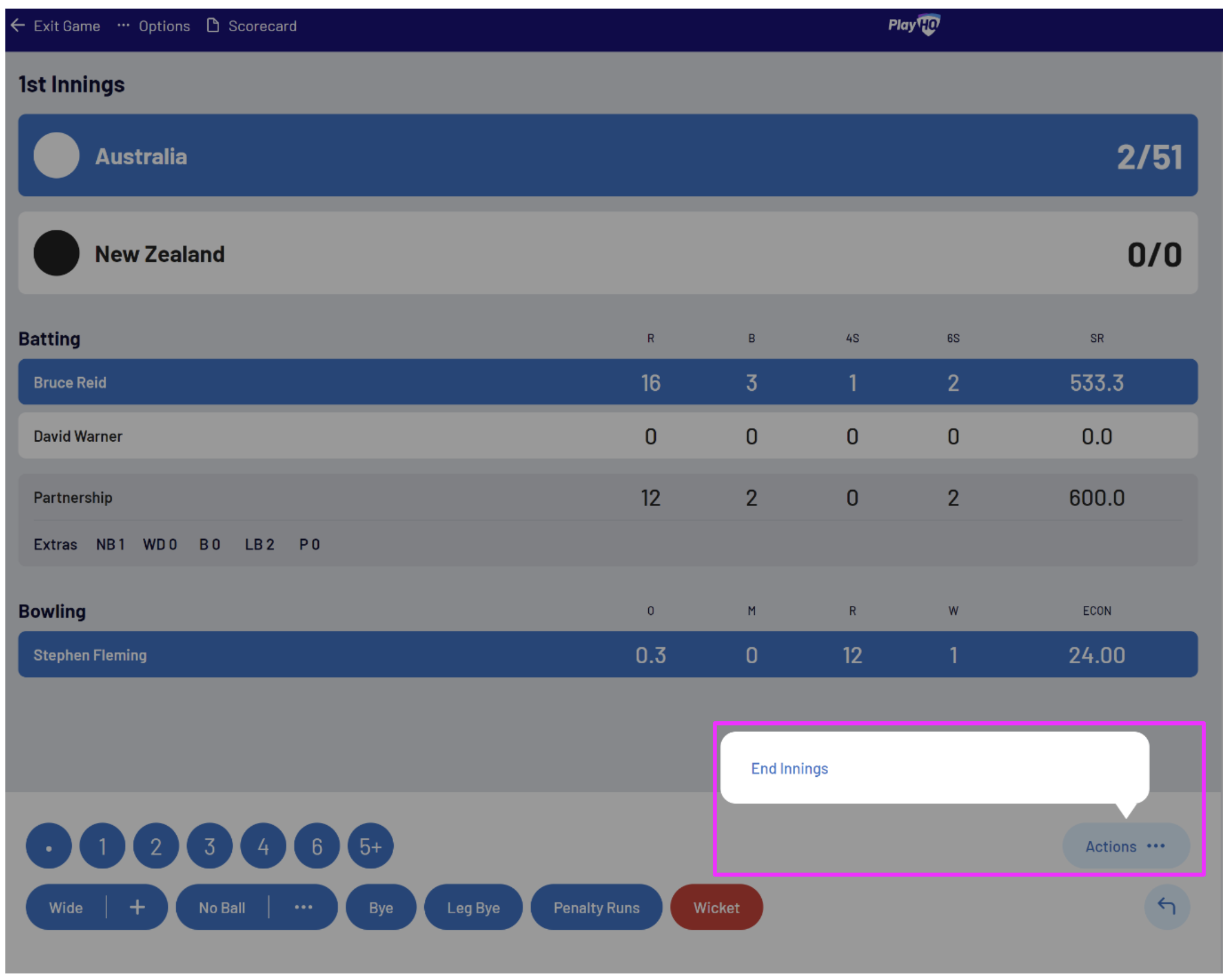 To end an innings manually, select Actions then End Innings: