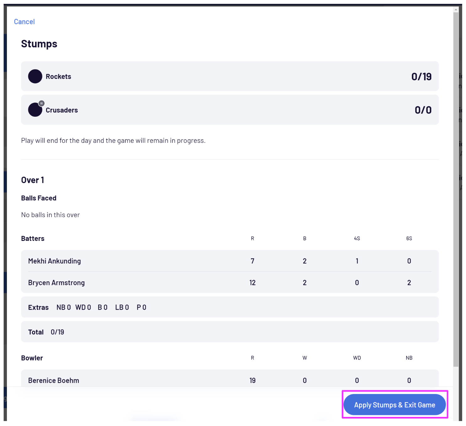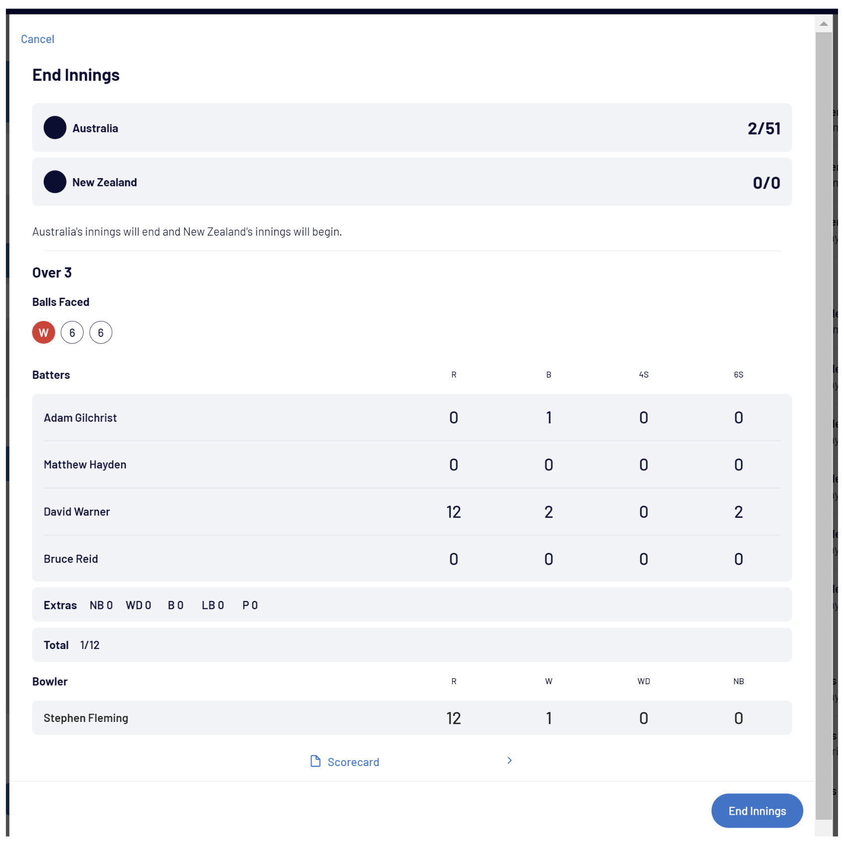 An End Innings modal will pop up which displays the current team scores and a summary of all the events that occurred within that over.