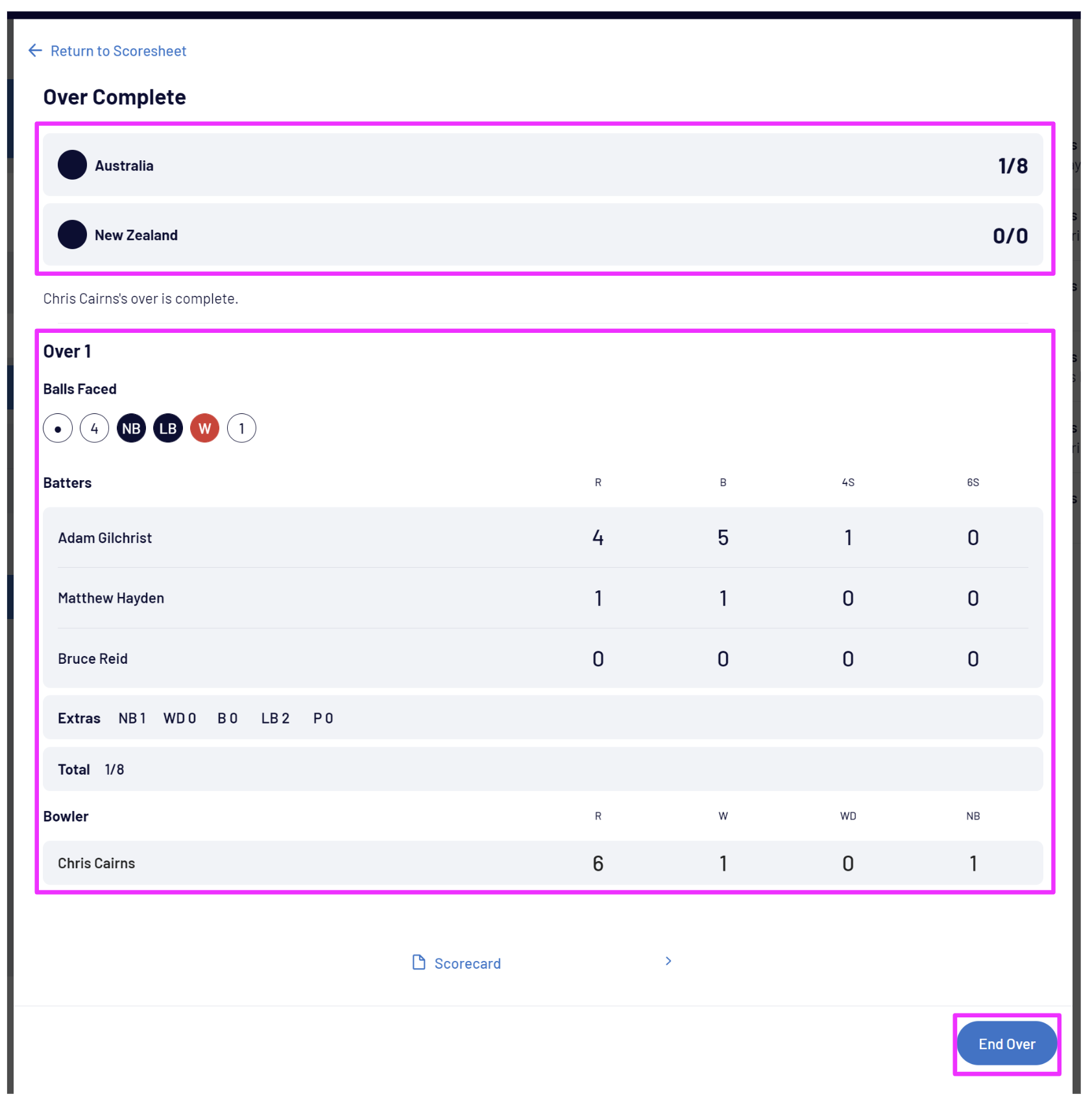 At the end of the over, you can either select Return to Scoresheet to make updates to the over, Scorecard to view or adjust the team scores or batter statistics, or select End Over to commence the next over: