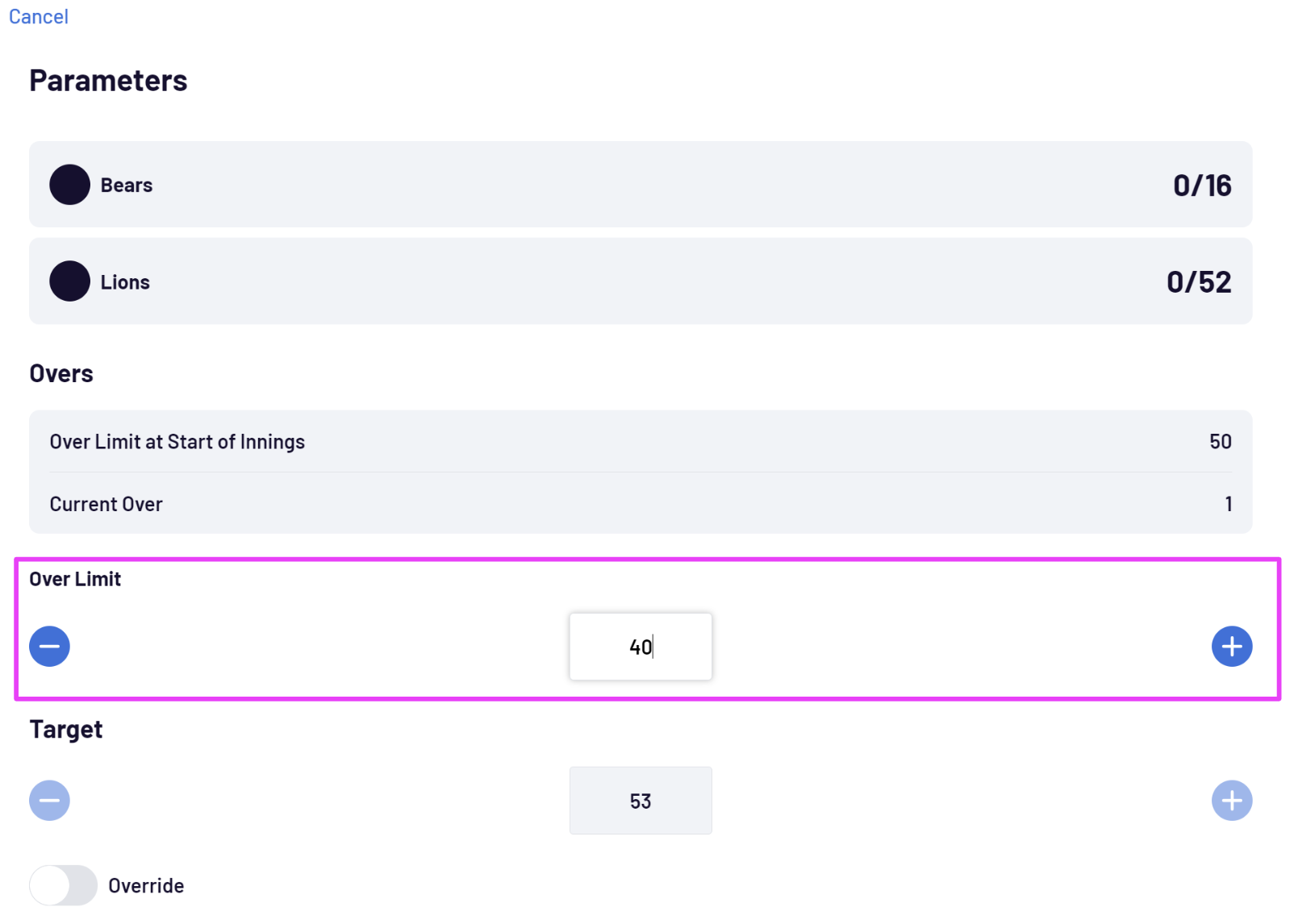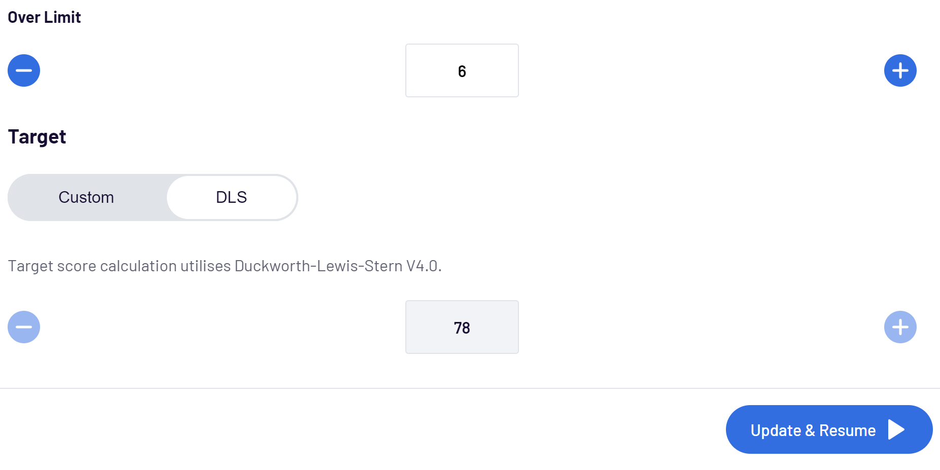 You can also use DLS calculation to automatically update the target score based on Duckworth-Lewis-Stern V4.0