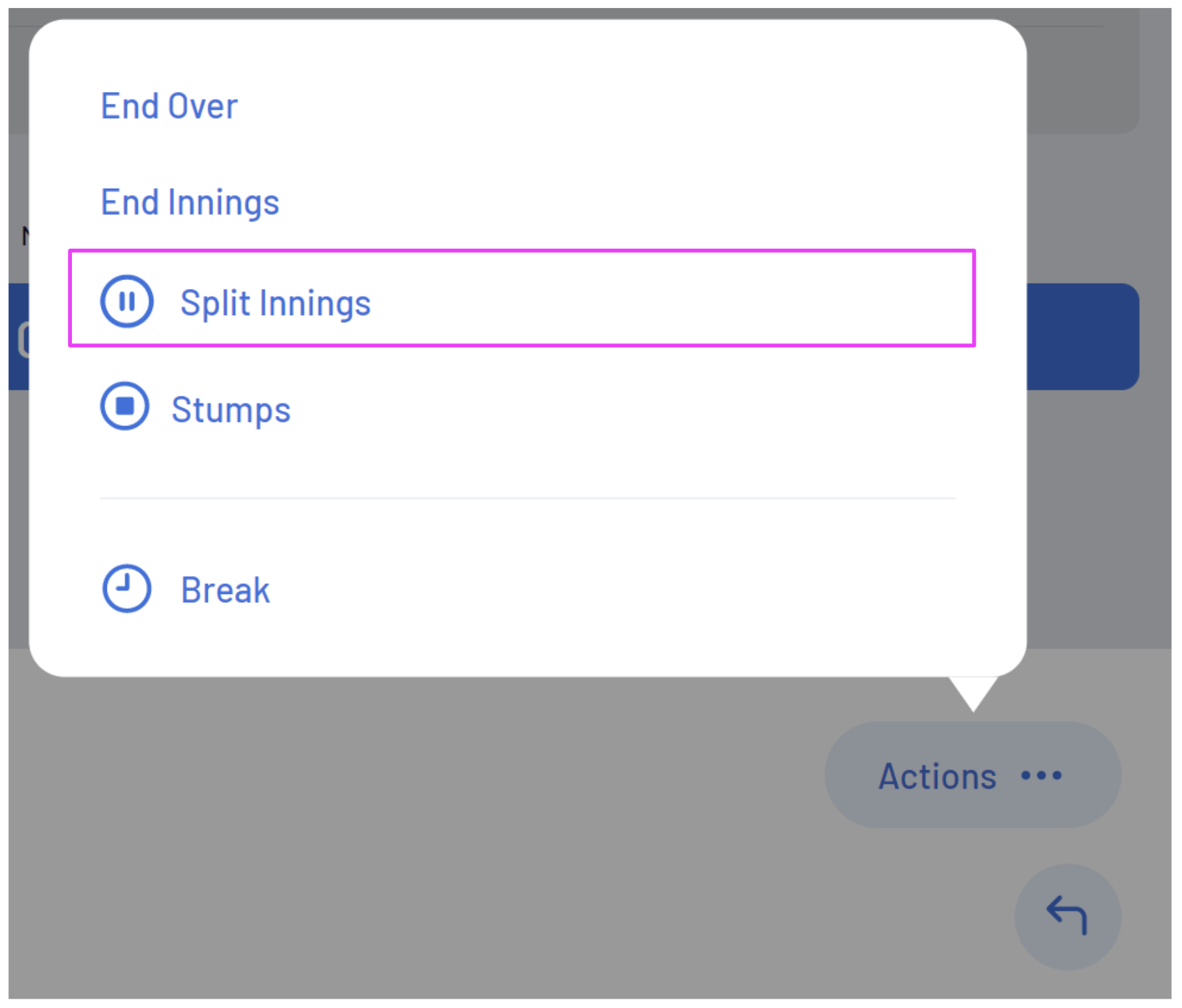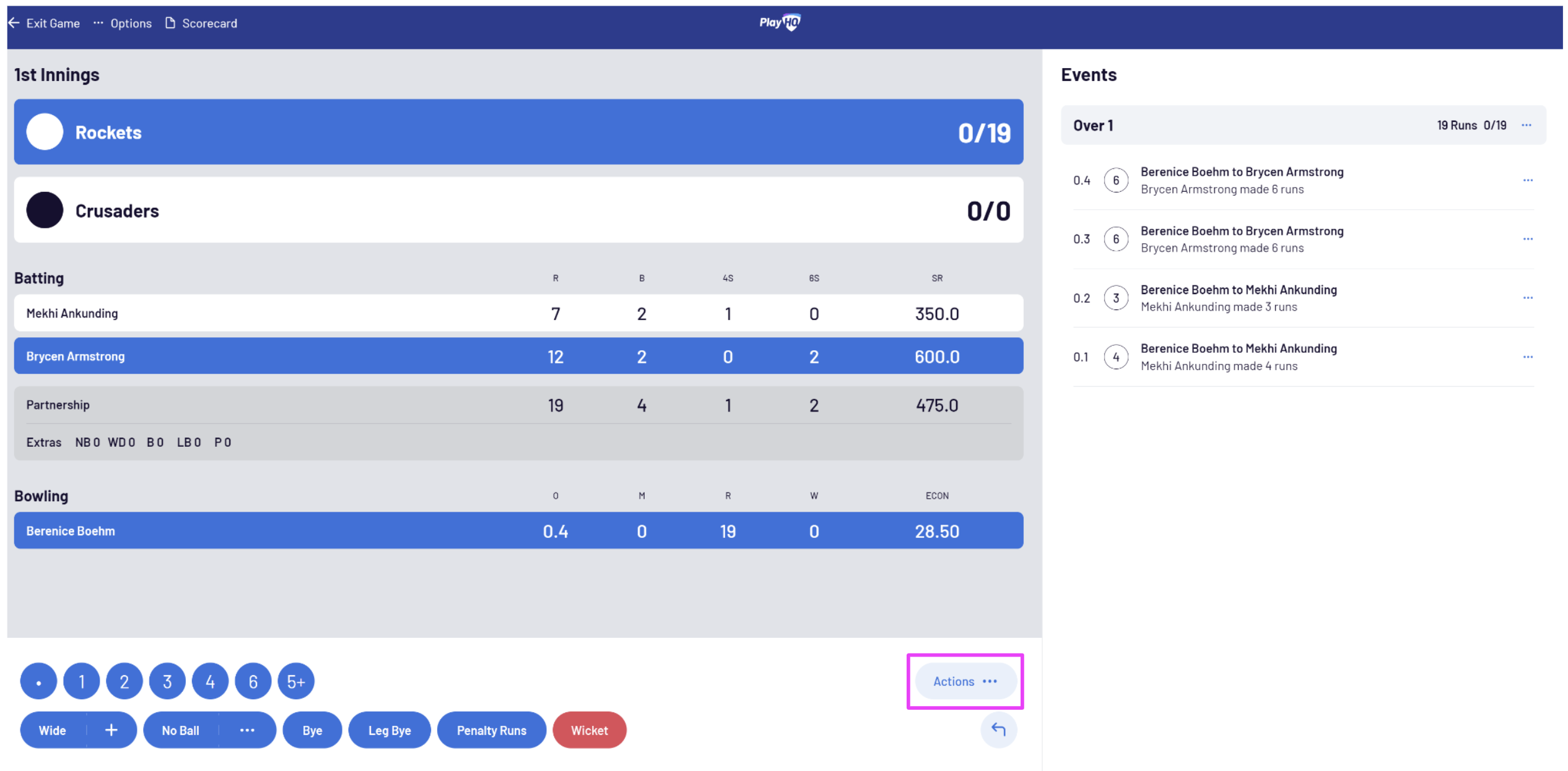 To resume the 1st teams innings, select the Actions button