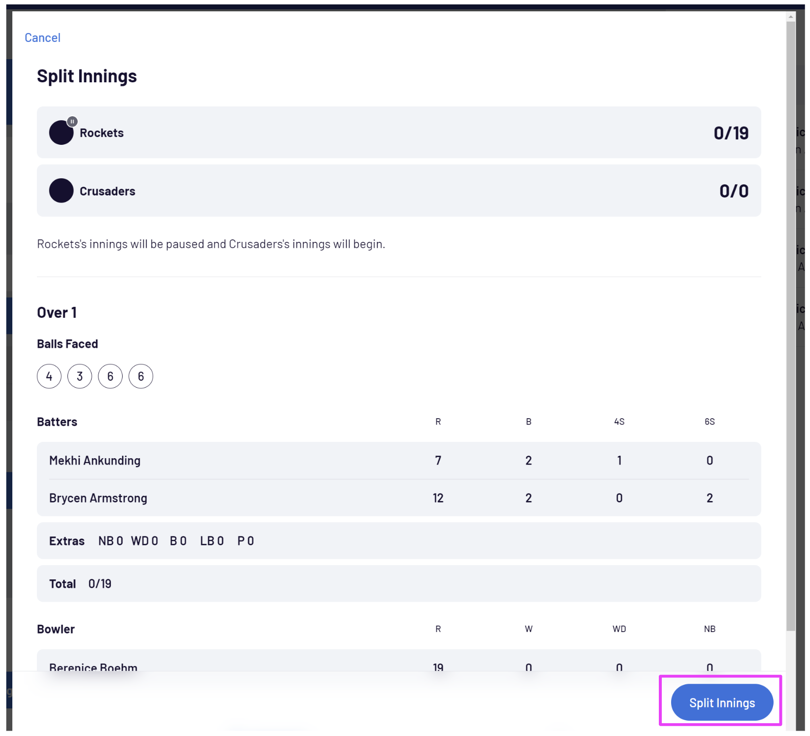 Splitting an innings allows the scorer to pause the 1st teams 1st innings and commence the 2nd teams 1st innings. This allows both teams to bat and bowl without needing to complete an innings. Once an innings is paused, it can be resumed at any point.