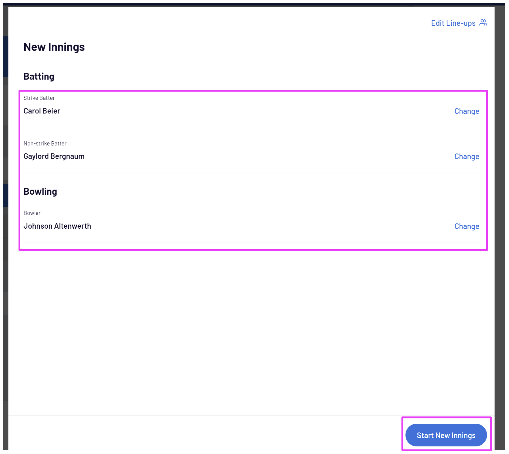 Set up the 2nd teams innings as required, by selecting the batters and bowler and select Start New Innings