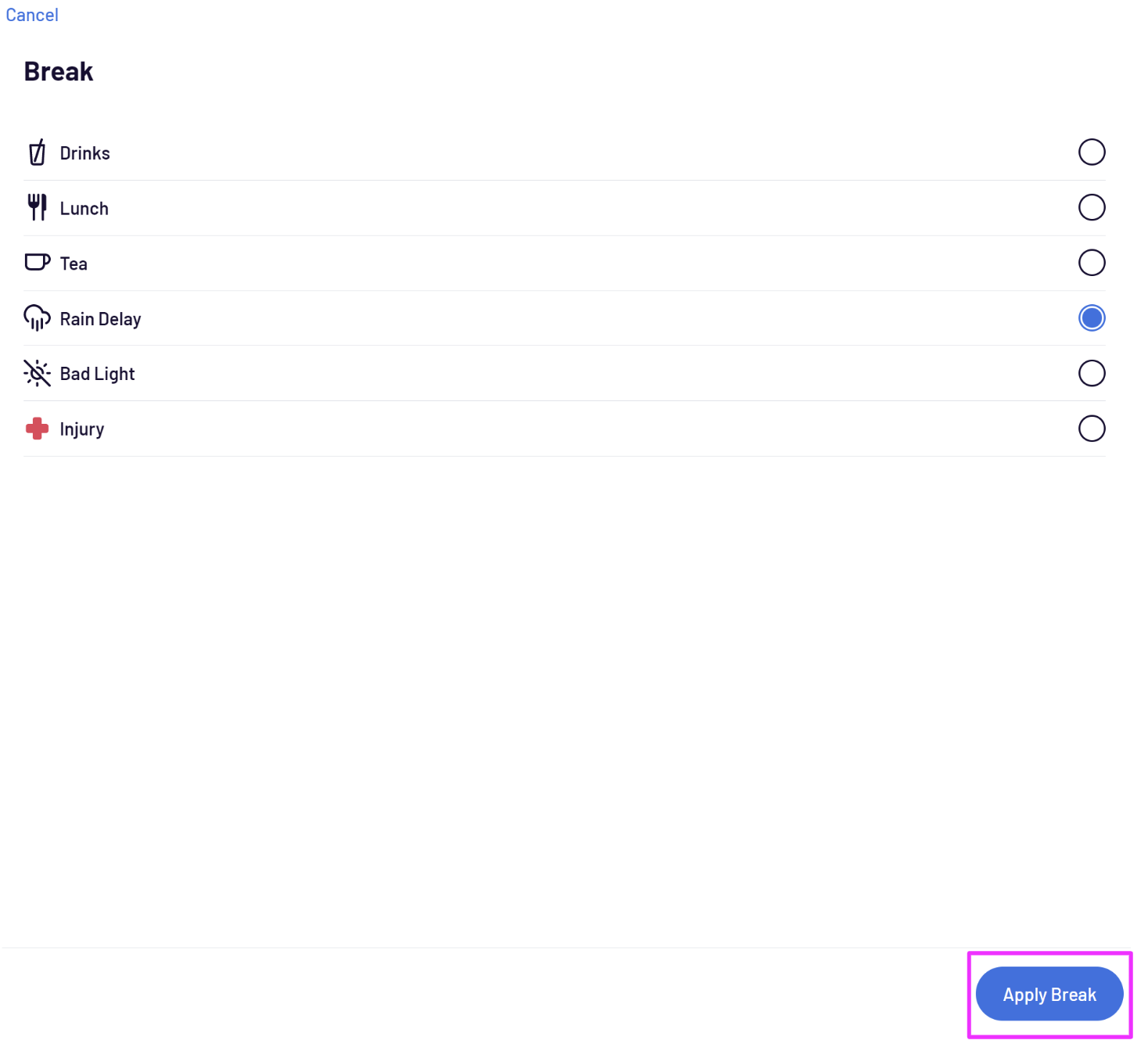 This article explains how to record a break in play within the PlayHQ cricket e-scoring app