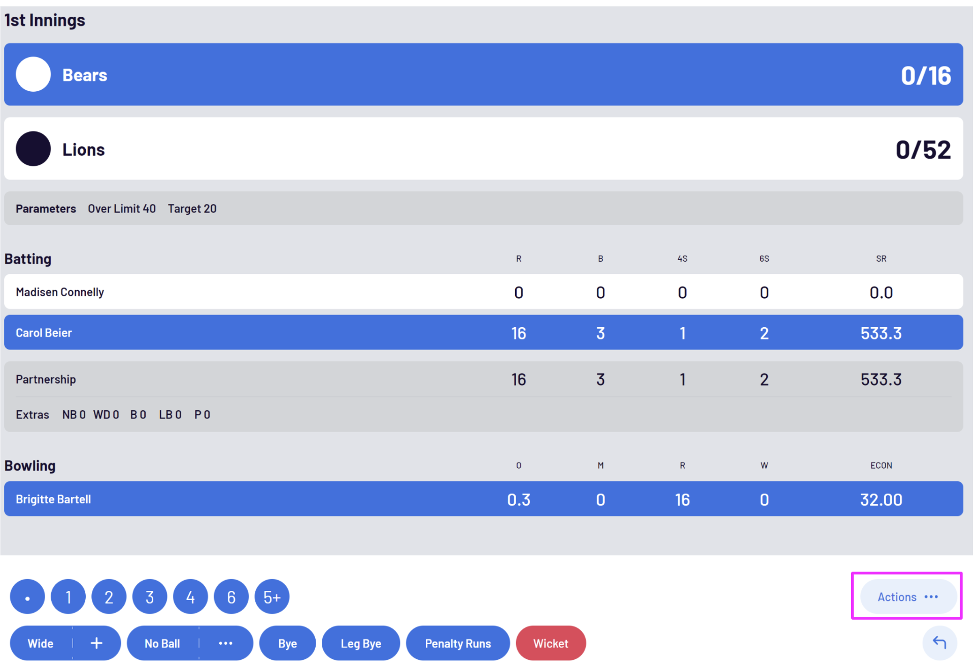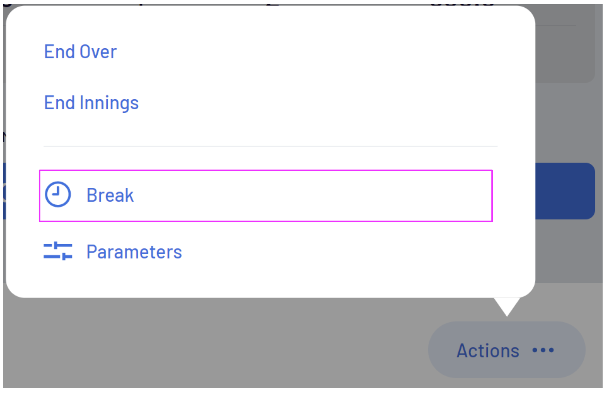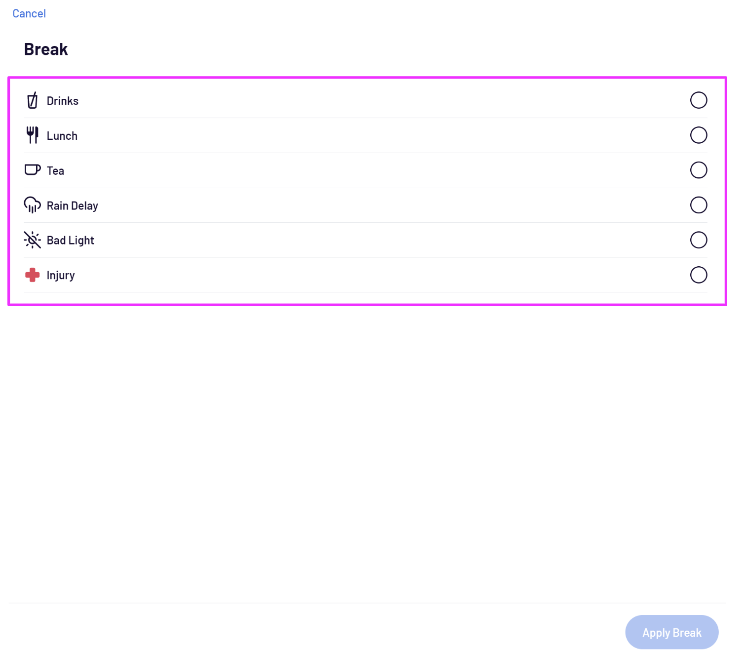 During the break, you will no longer be able to add events to the game, however you can edit events, make scorecard adjustments, change line-ups and change batter or bowler