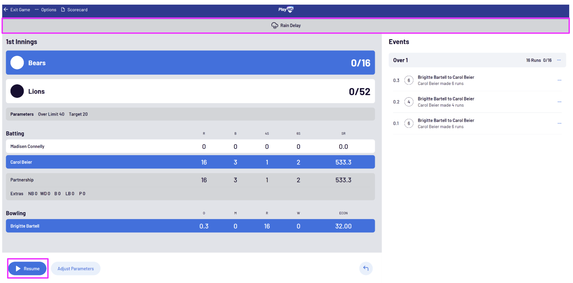 To resume from a break, select Resume, and the scoresheet will revert back to normal