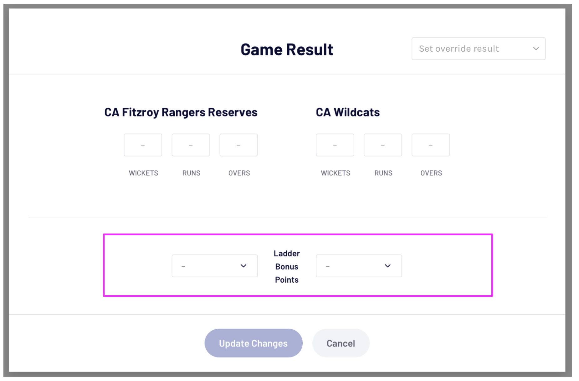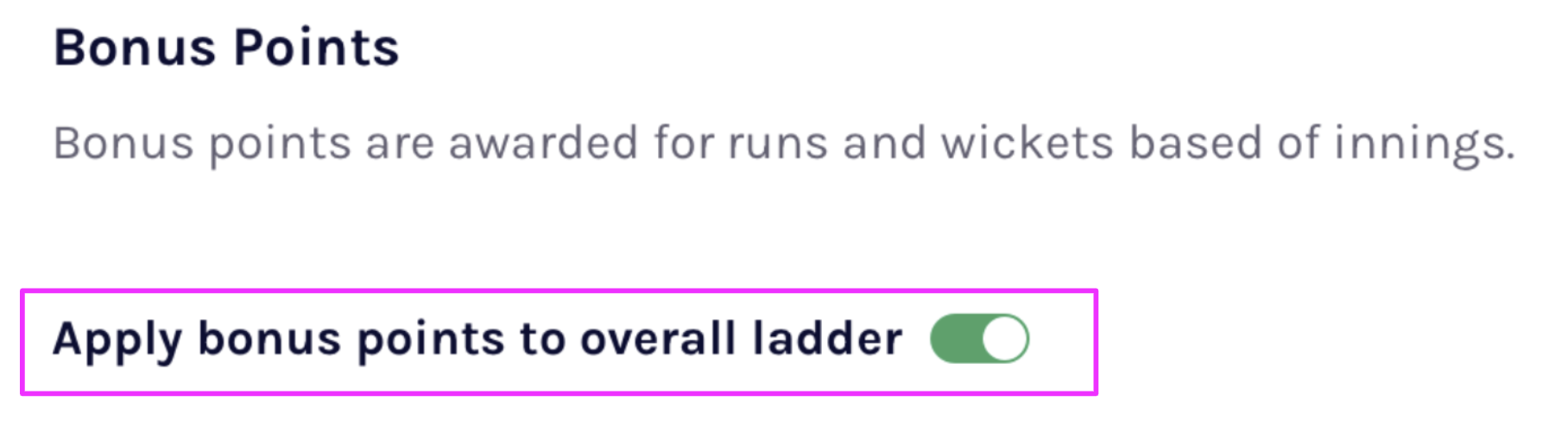 Associations can choose whether the bonus points applies to the Overall Ladder or just this Game Type (T20, One Day & Two Day) ladder. THis only applies to Cricket