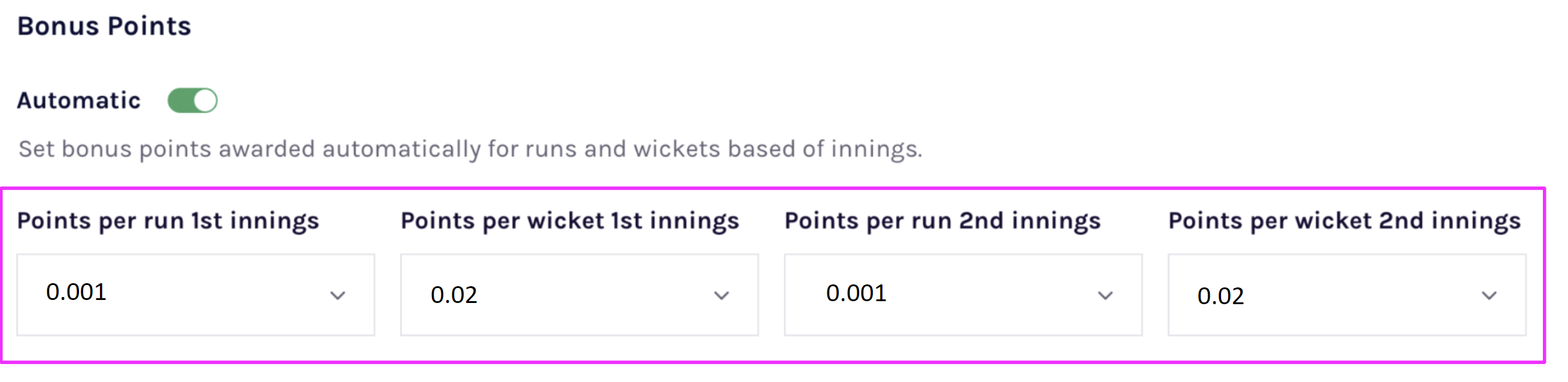 Automatic Bonus Points will be derived based on the the runs and wickets scored by each times multipled by the number configured in the grade setting. These will automatically added to the ladder under BP (Bonus Points)