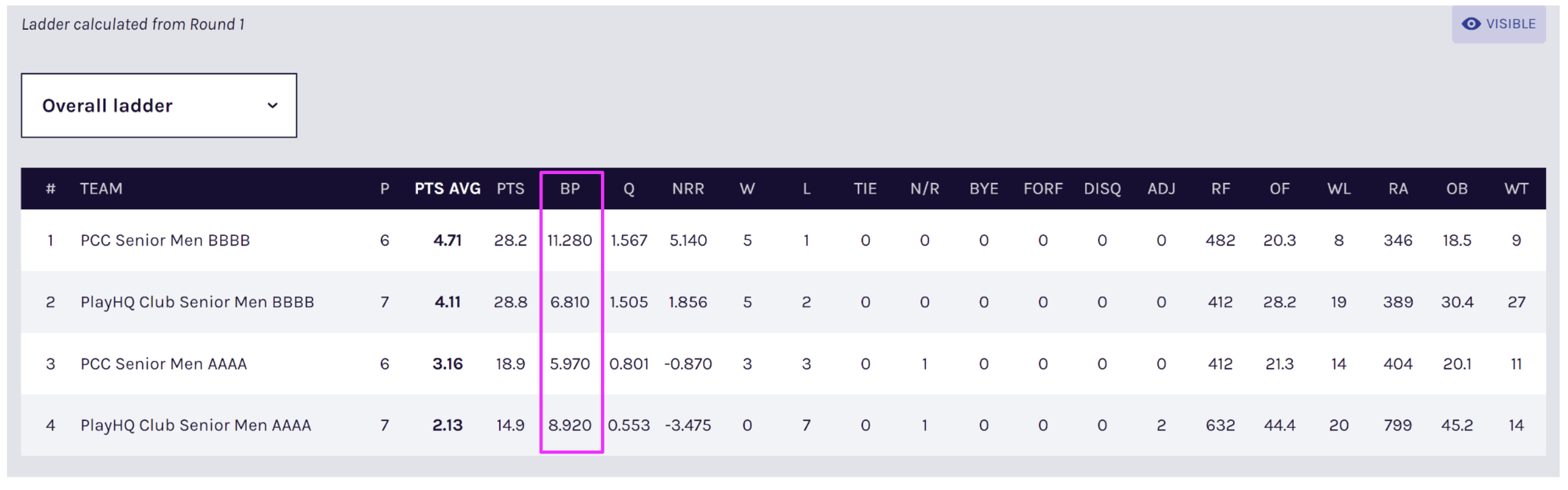Total Ladder Points: The total of Game Outcome points plus Bonus Points awarded throughout a season.