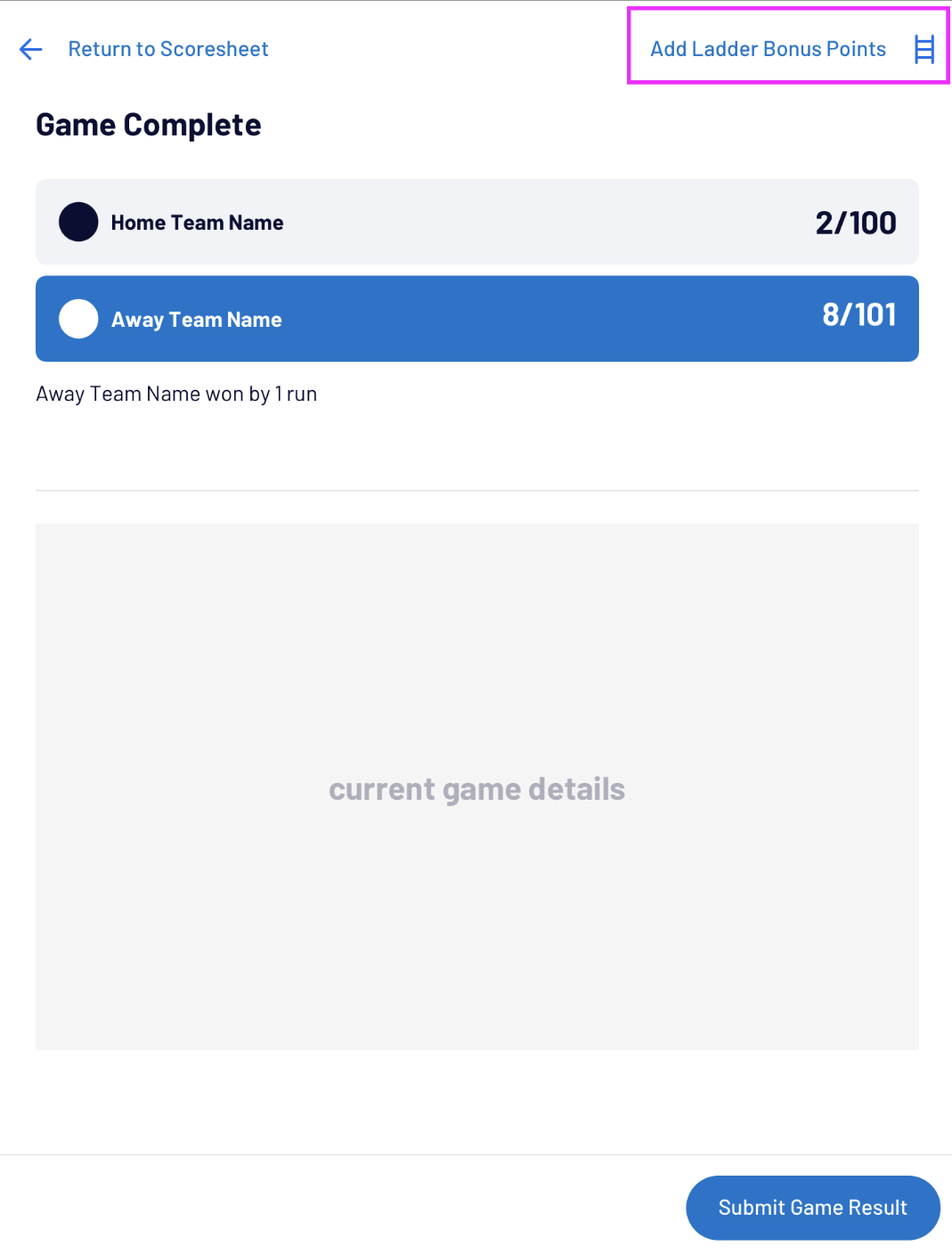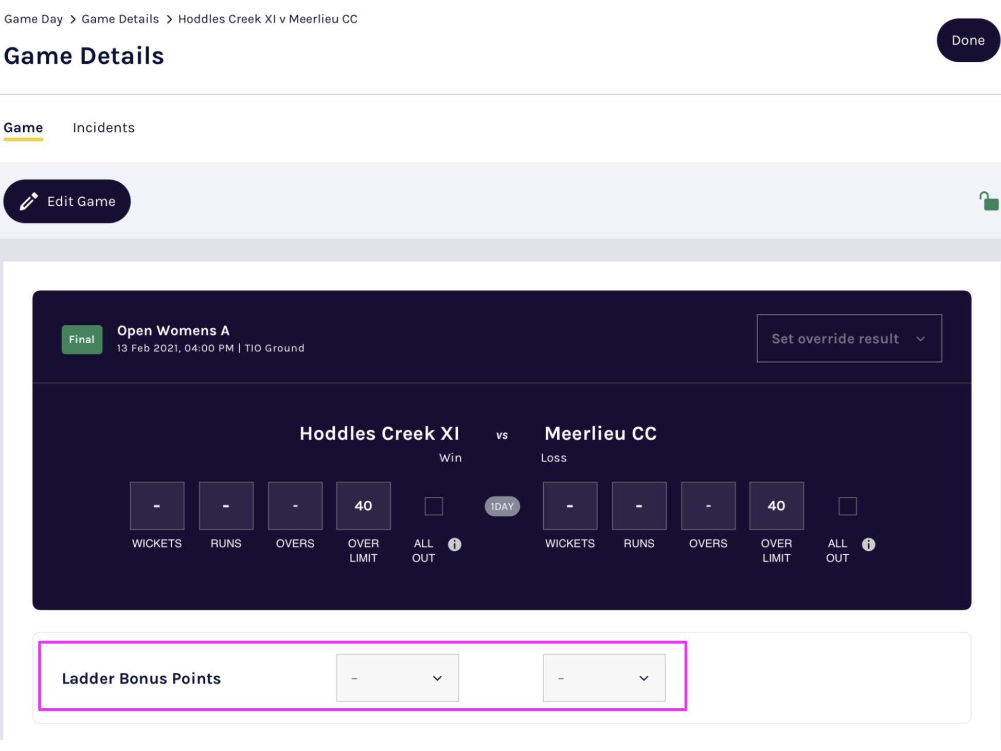 Club or Association Admins can enter Manual Bonus Points in the Game Details section of the Admin Portal