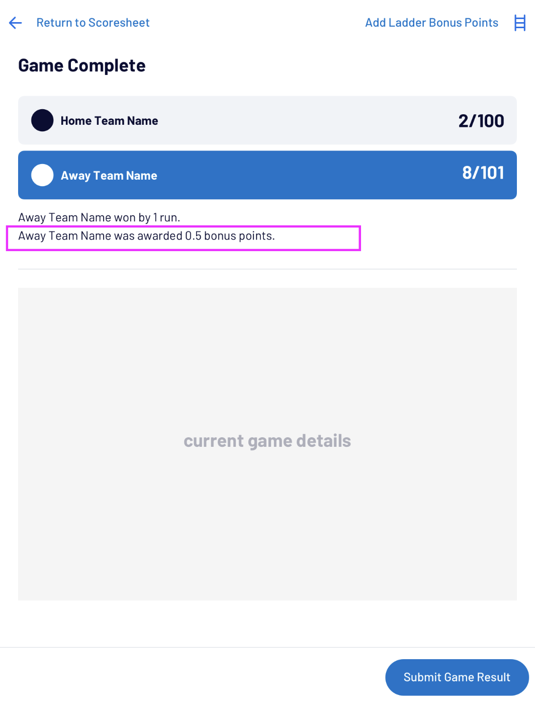 Scorers can enter Manual Bonus Points prior to submitting the game: