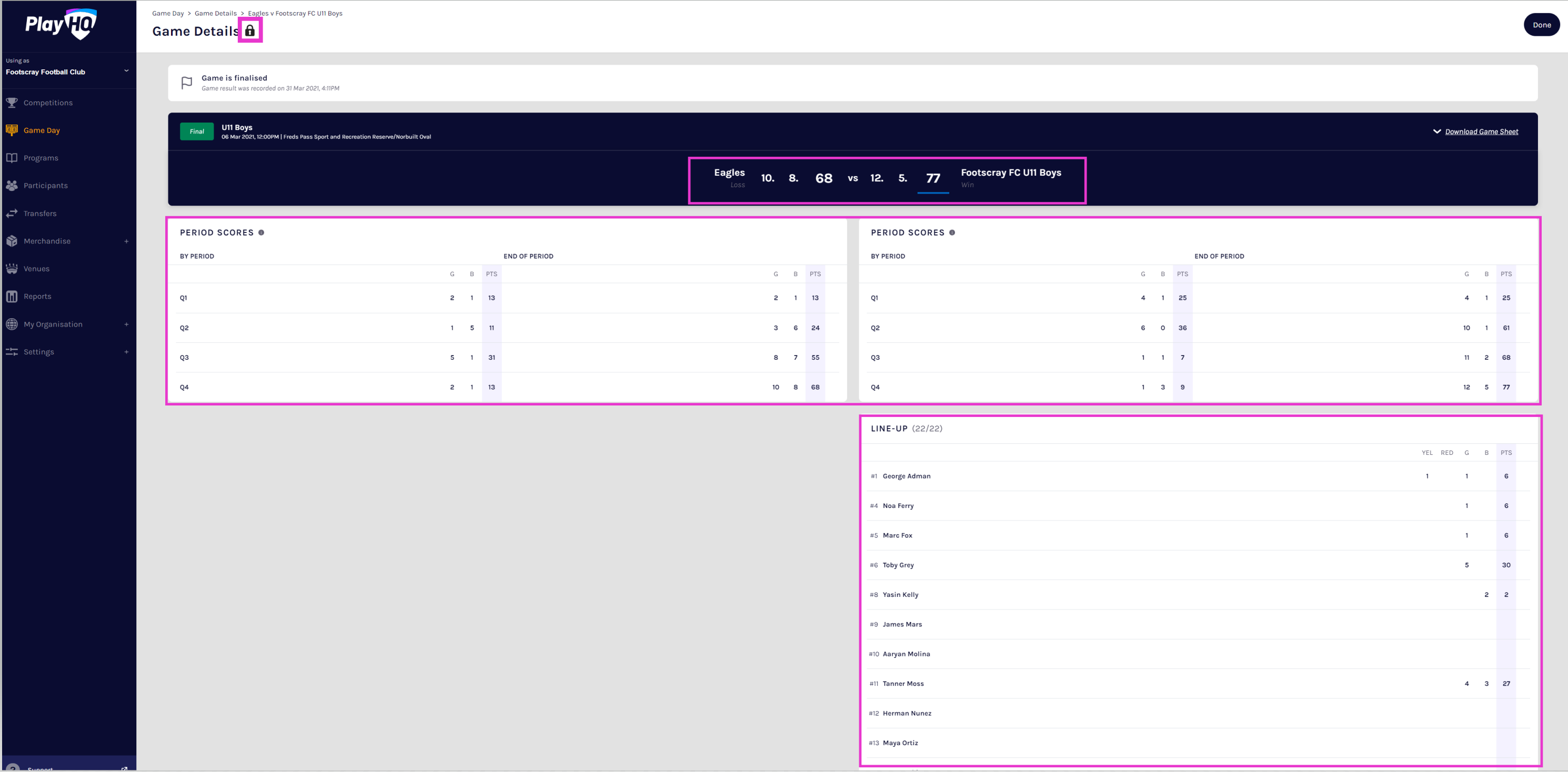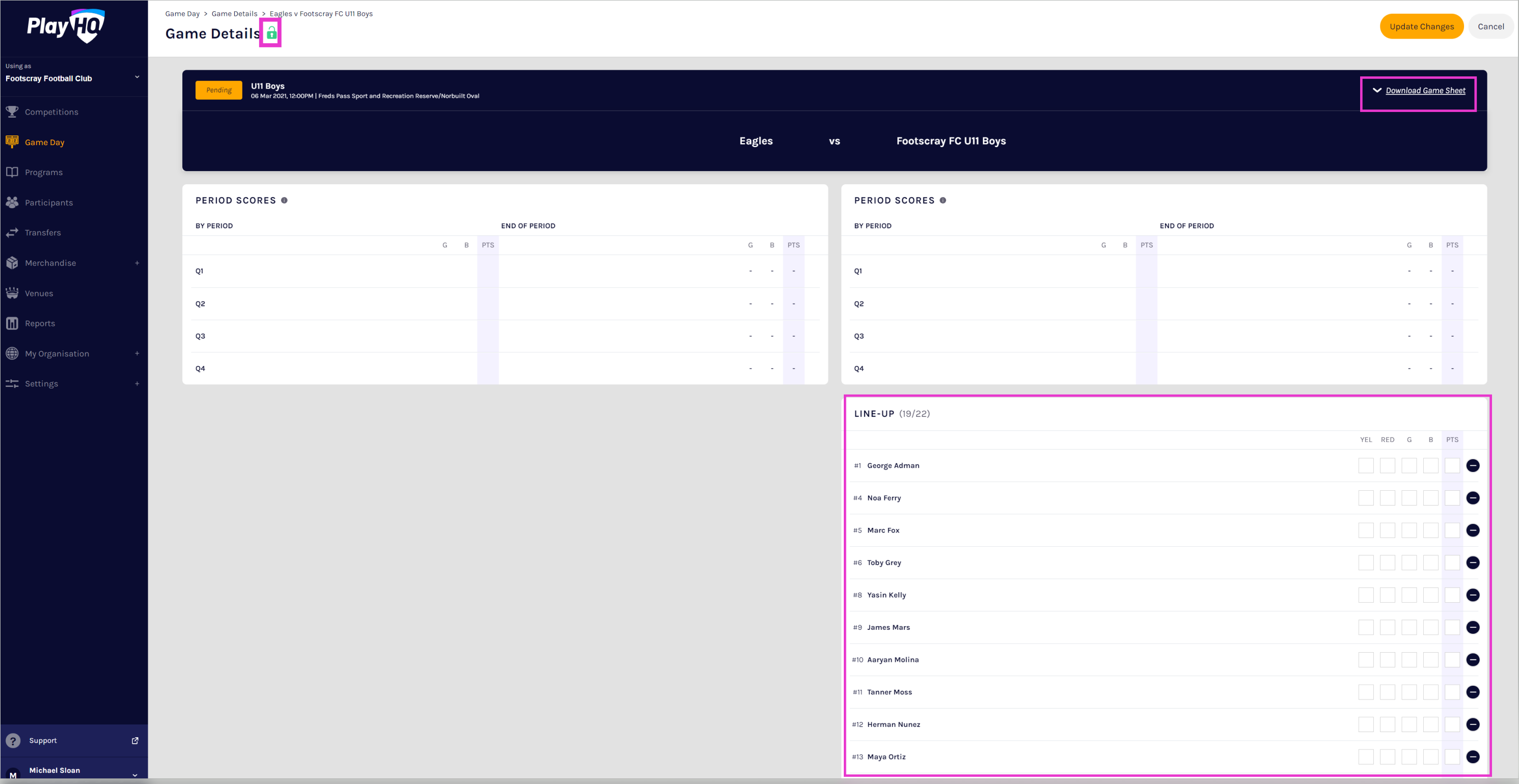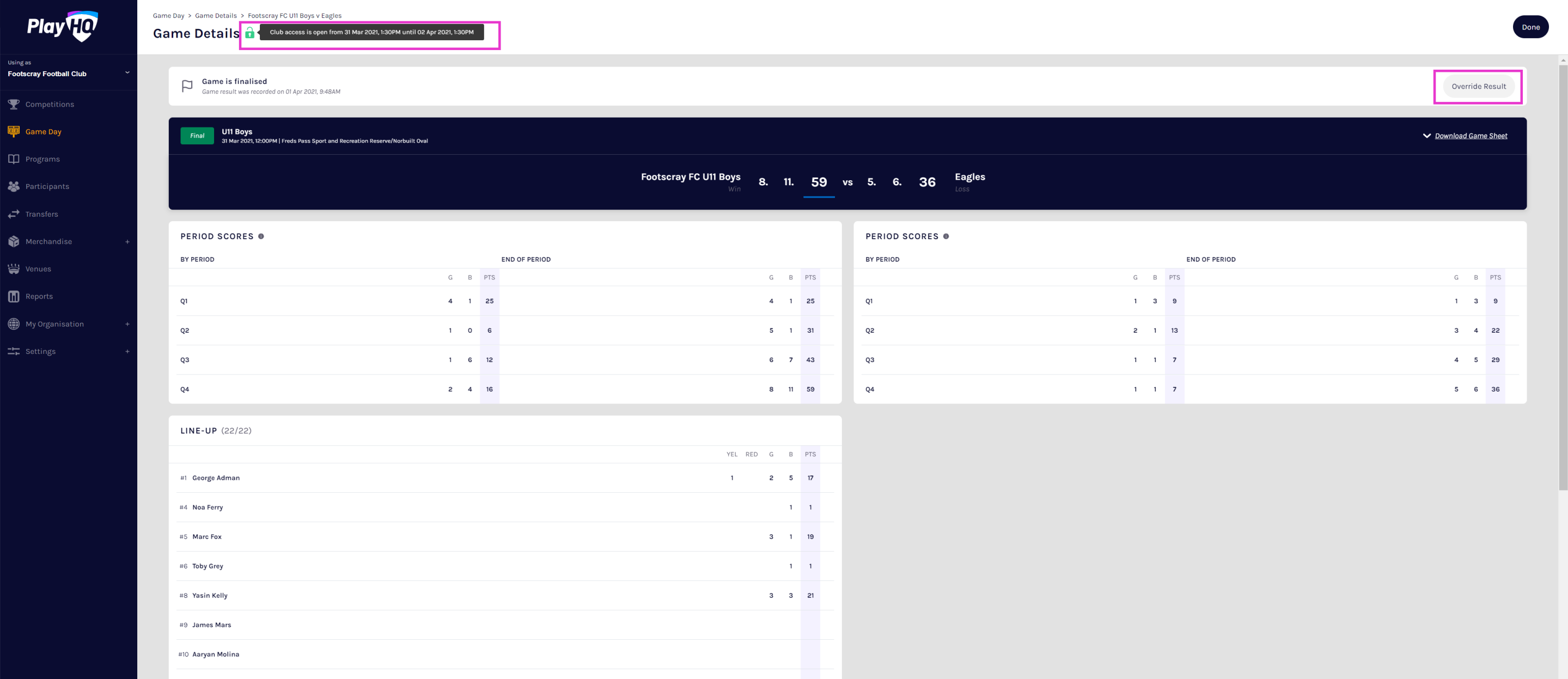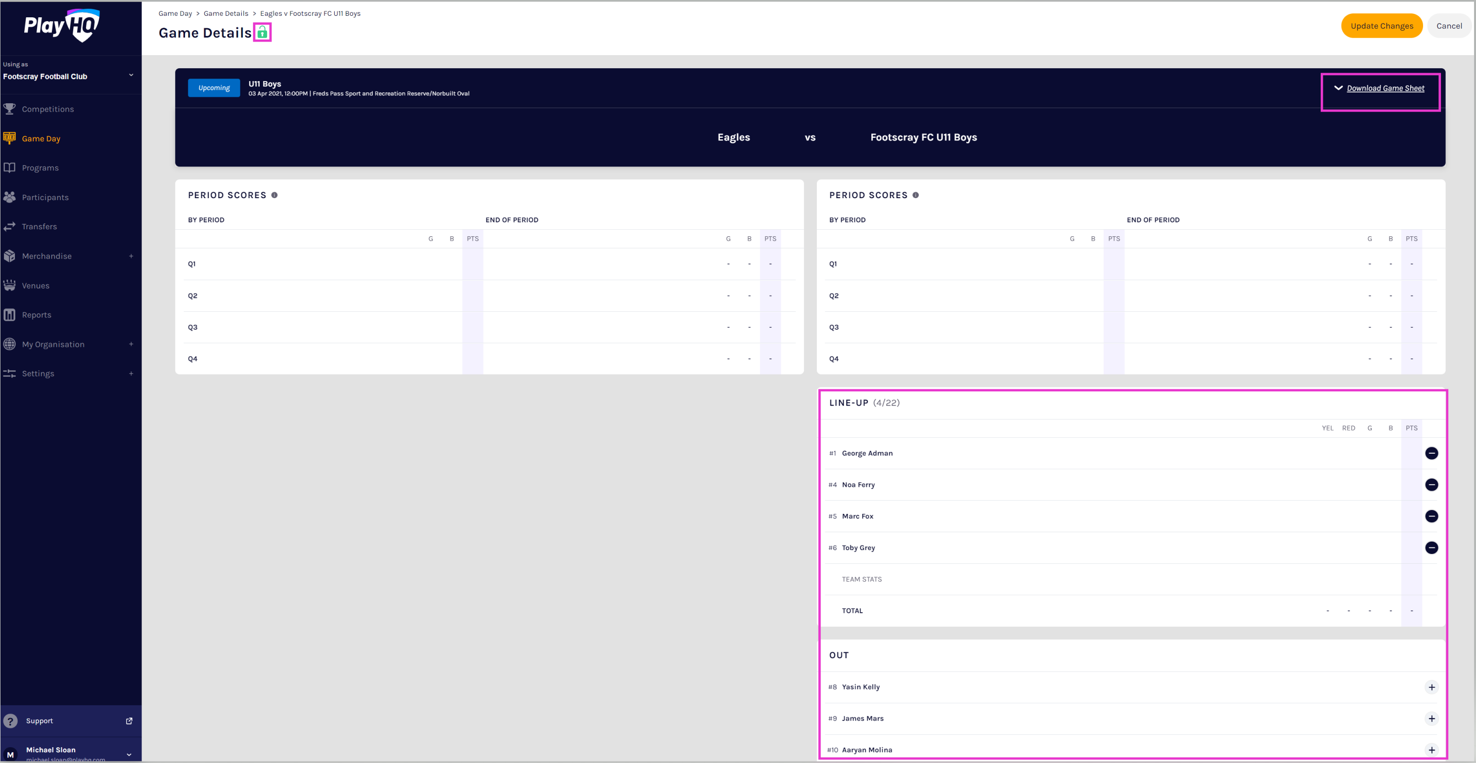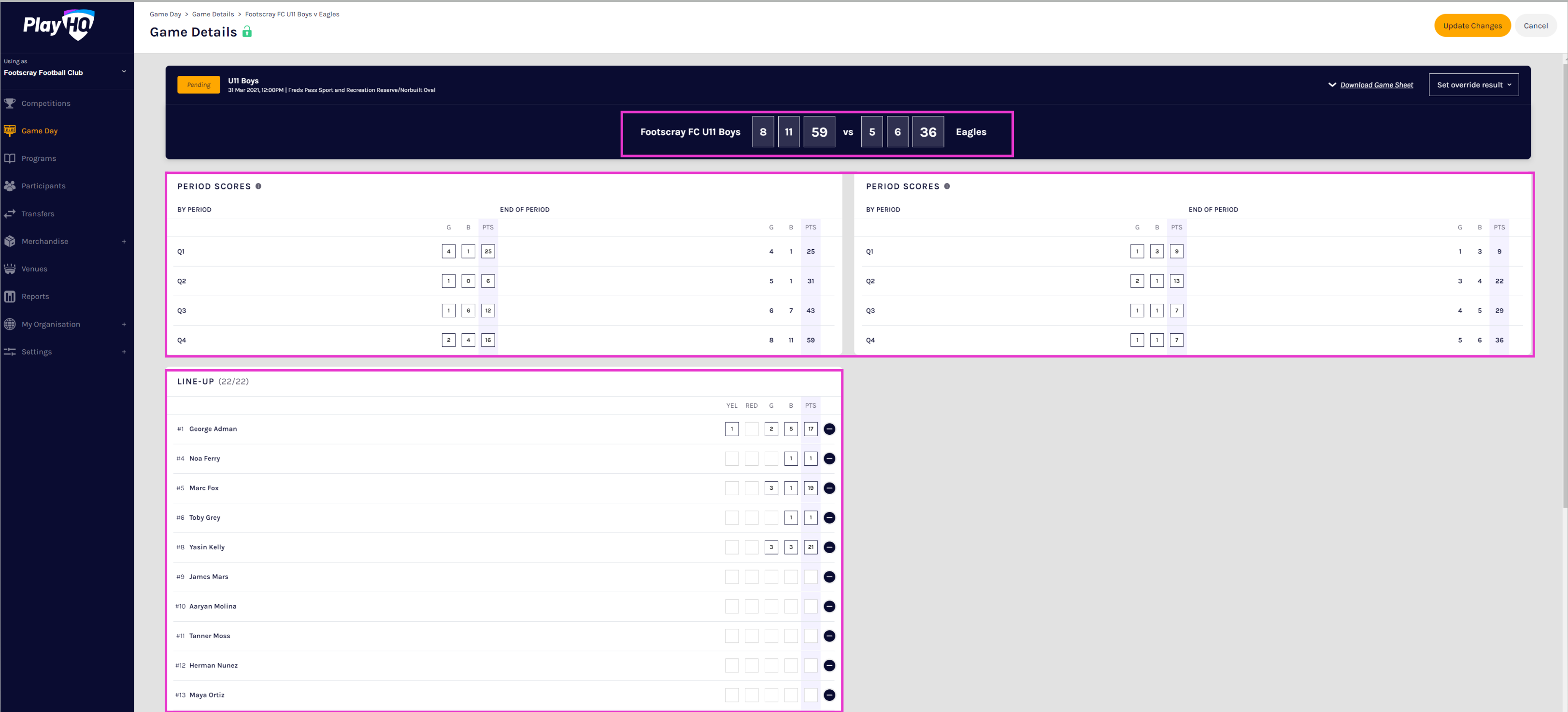 For many sports, the Club Administrator plays a key role in ensuring competitions are run efficiently and accurately. To manage game details such as lineups and statistics, Club admins can access the Game Day menu. In addition, if given access from their Association, Club admins can also enter period and game scores and manage both teams lineups.