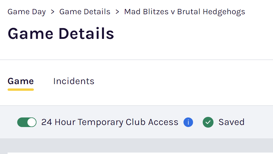 If the club misses this window and is locked out of entering results, the association can provide 24 hour Temporary Club Access by toggling it on for the specific game: