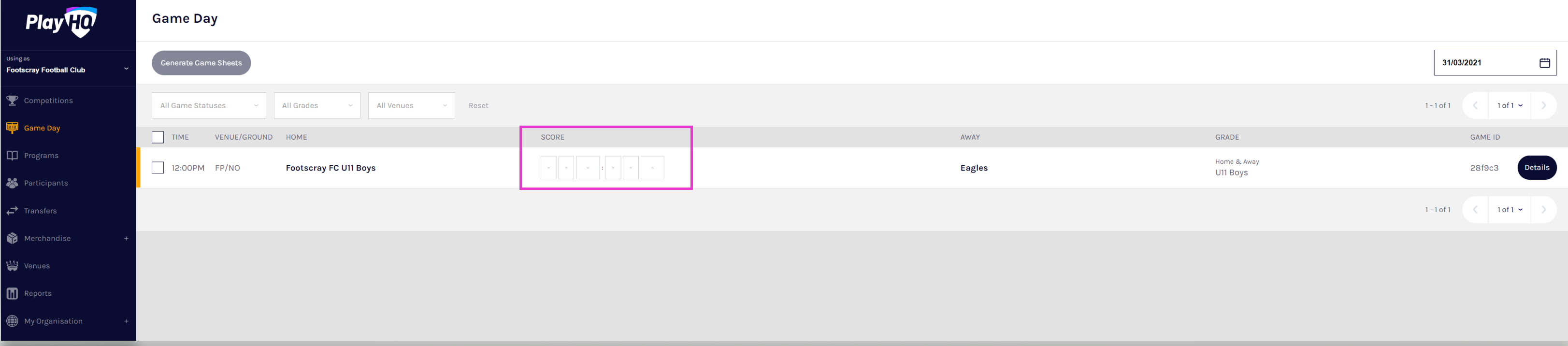 Club Admin Access to Game day - Enter Scores