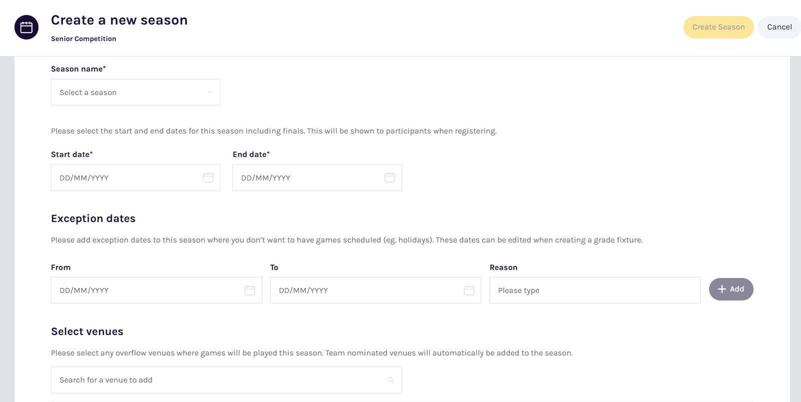 | Select venues | Search for and select all venues that will be used for this season. Venues are configured by the sports governing body. The Selecting the venues used in a season article contains further instructions. |