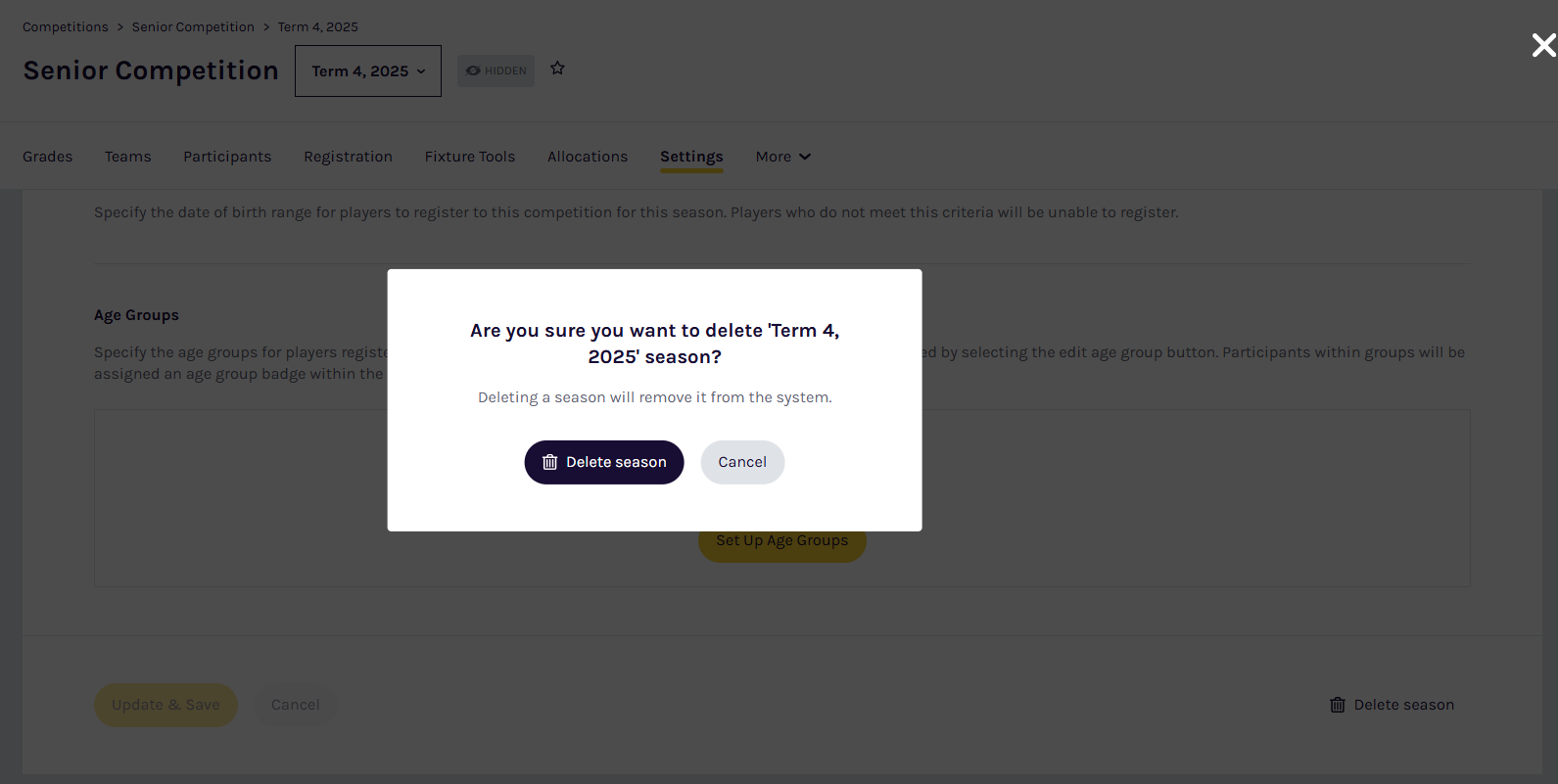 - Confirm the deletion by clicking Delete season, or click Cancel to return to the previous page without deleting the season.