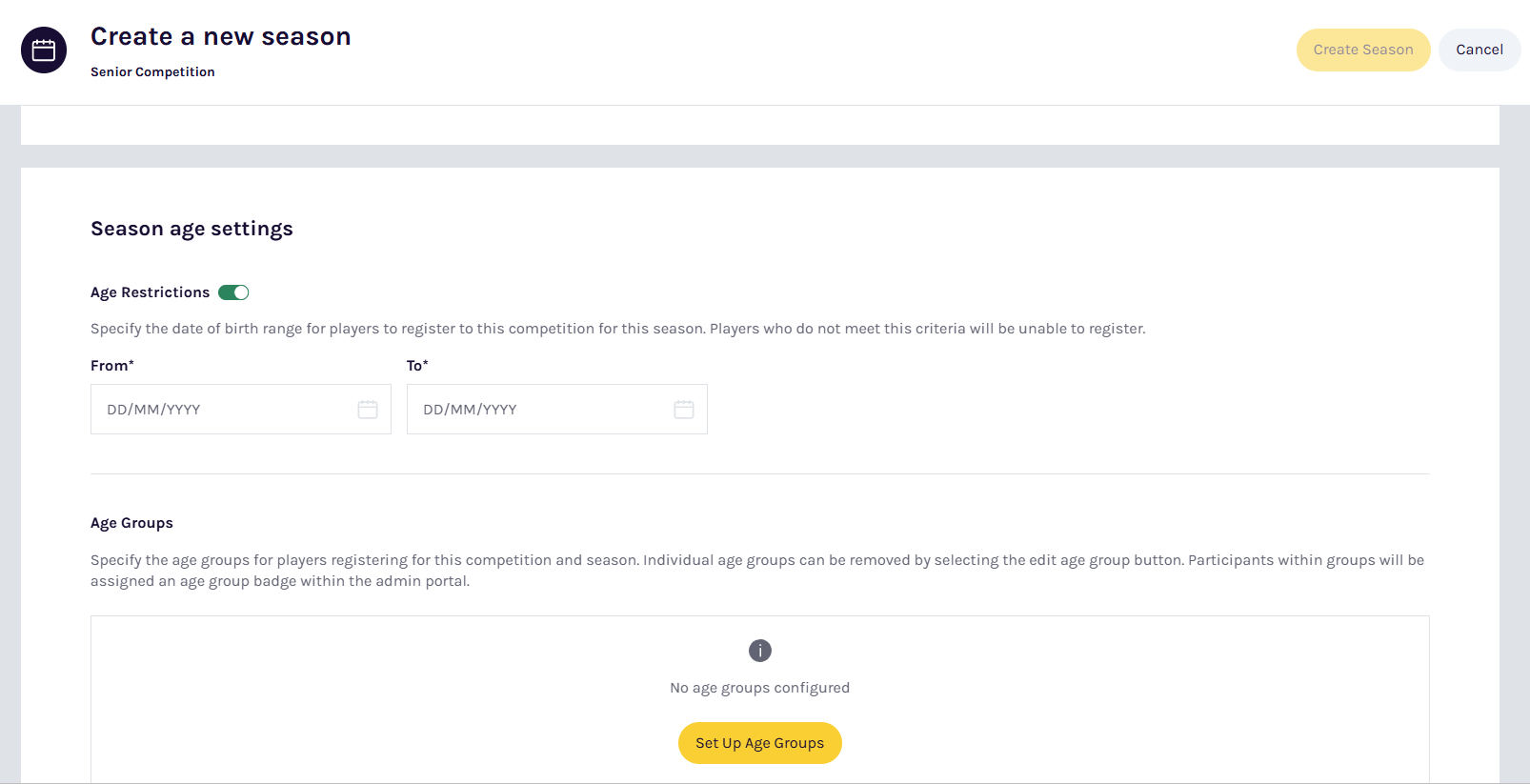 Age Restrictions can be set to limit season registrations to specific ages. This range is then displayed to participants in the competition and during registration. Administrators can turn restrictions on or off at any time. Clubs participating in a competition season inherit the age restrictions configured by the association or admin body. Registration forms for Participant to Season, Participant to Team and Participant to Club Team will display the age range that has been set. |
