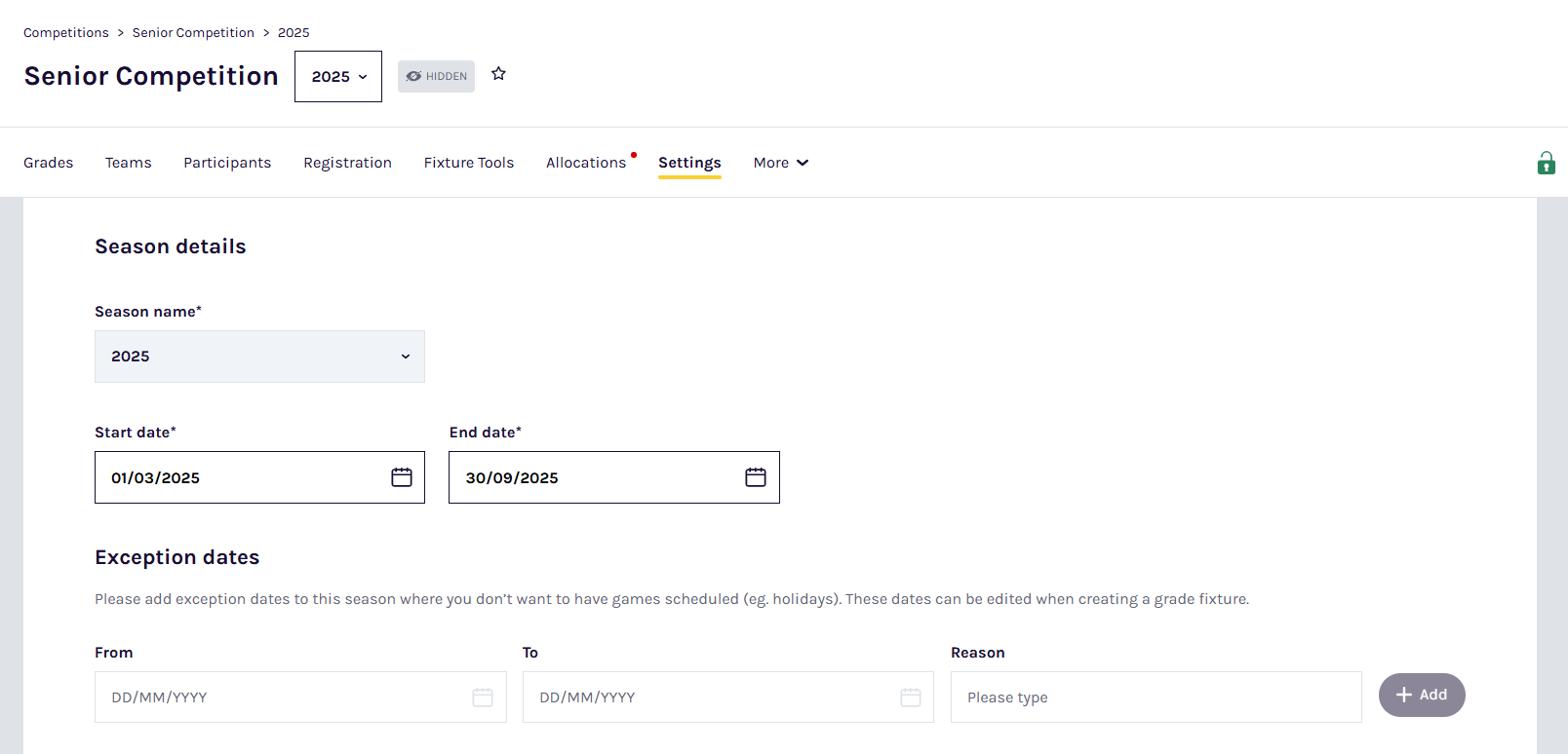 | Exception dates | Enter the From and To dates and provide a brief Reason for any exception dates that apply across grades in the season. The PlayHQ fixture generation engine will not schedule games to be played on any exception dates selected for a given grade. |