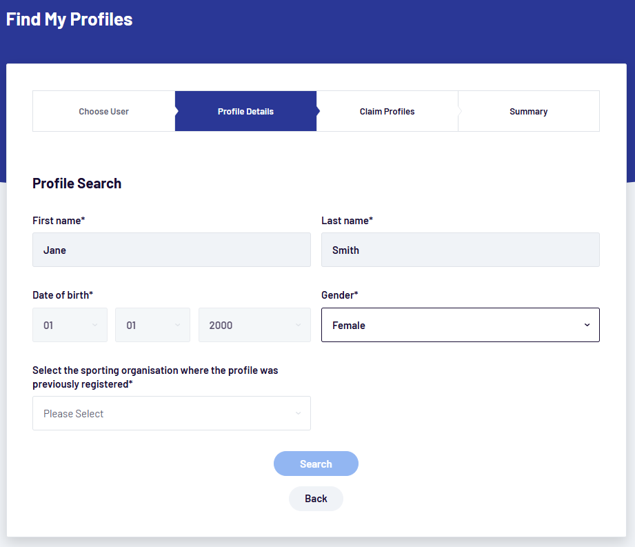 If you cannot verify a matching profile through Find My Profiles (for example, if it has an unverified email or mobile number you don't have access to), contact your sport's support team for assistance.