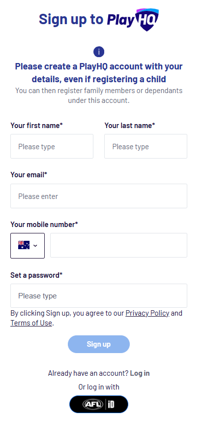 Follow these steps to create a PlayHQ account using AFLiD