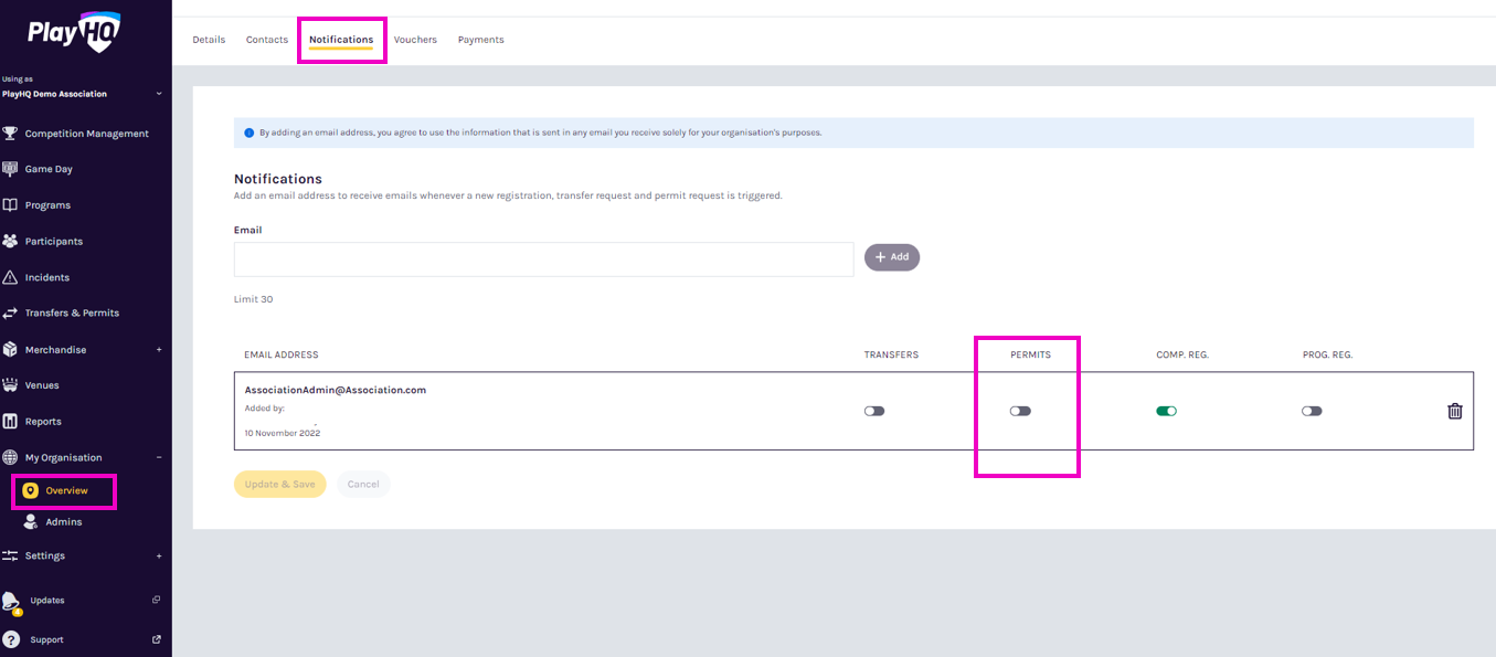Navigate to the Notifications tab within the My Organisation > Overview section. Populate the email address to which you want notifications to be sent to and select add. Then toggle the permits ON.