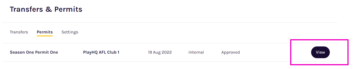 To approve or decline a season permit request, navigate to your organisation’s Transfers & Permits request list and switch to the Permits tab. Select View next to the season permit requiring your organisation’s approval: