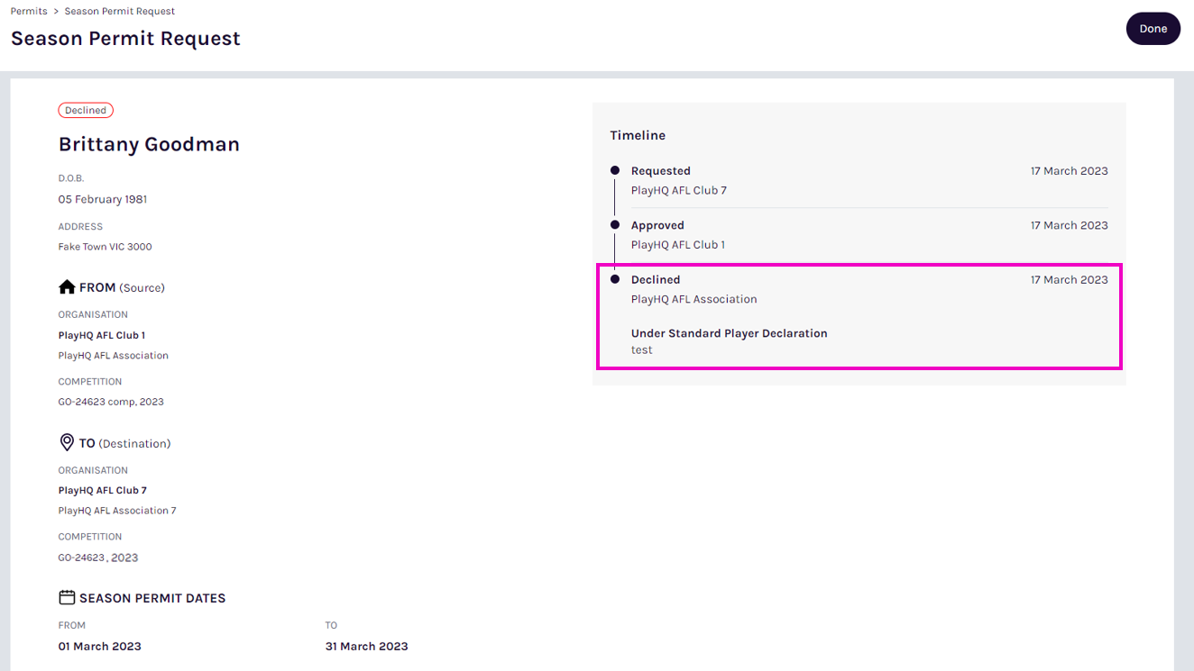 The status of the season permit request will change to Declined, and the reason and additional details that were added by the organisation who declined the request, will be made visible to all organisations within the approval flow.
