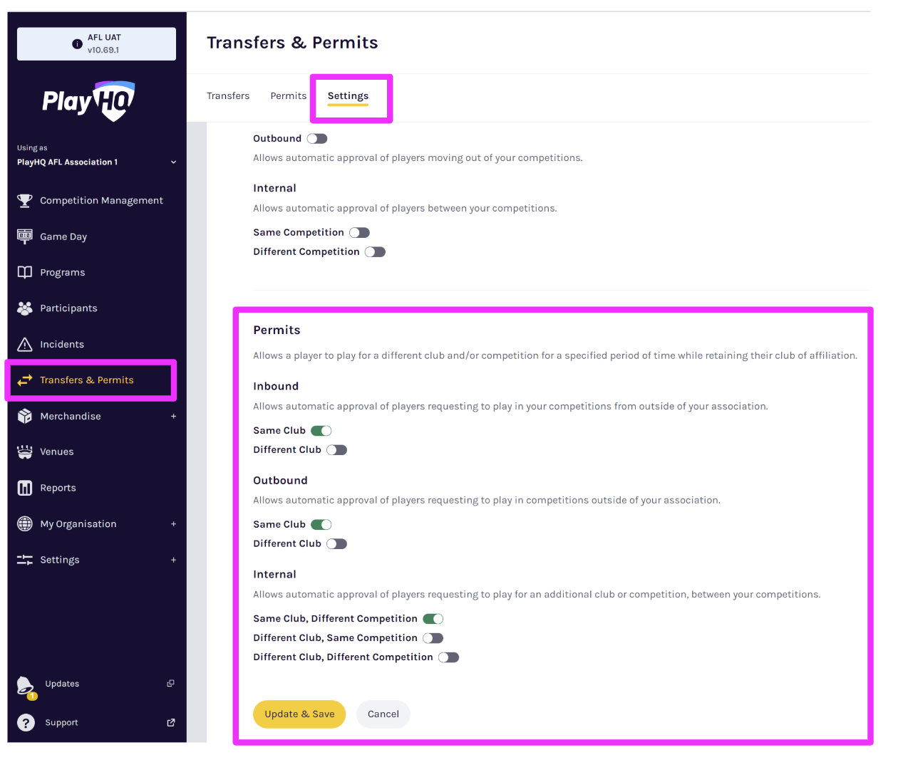 To receive player season permit notifications that require your club or association's approval, your organisation must enable season permit notifications.