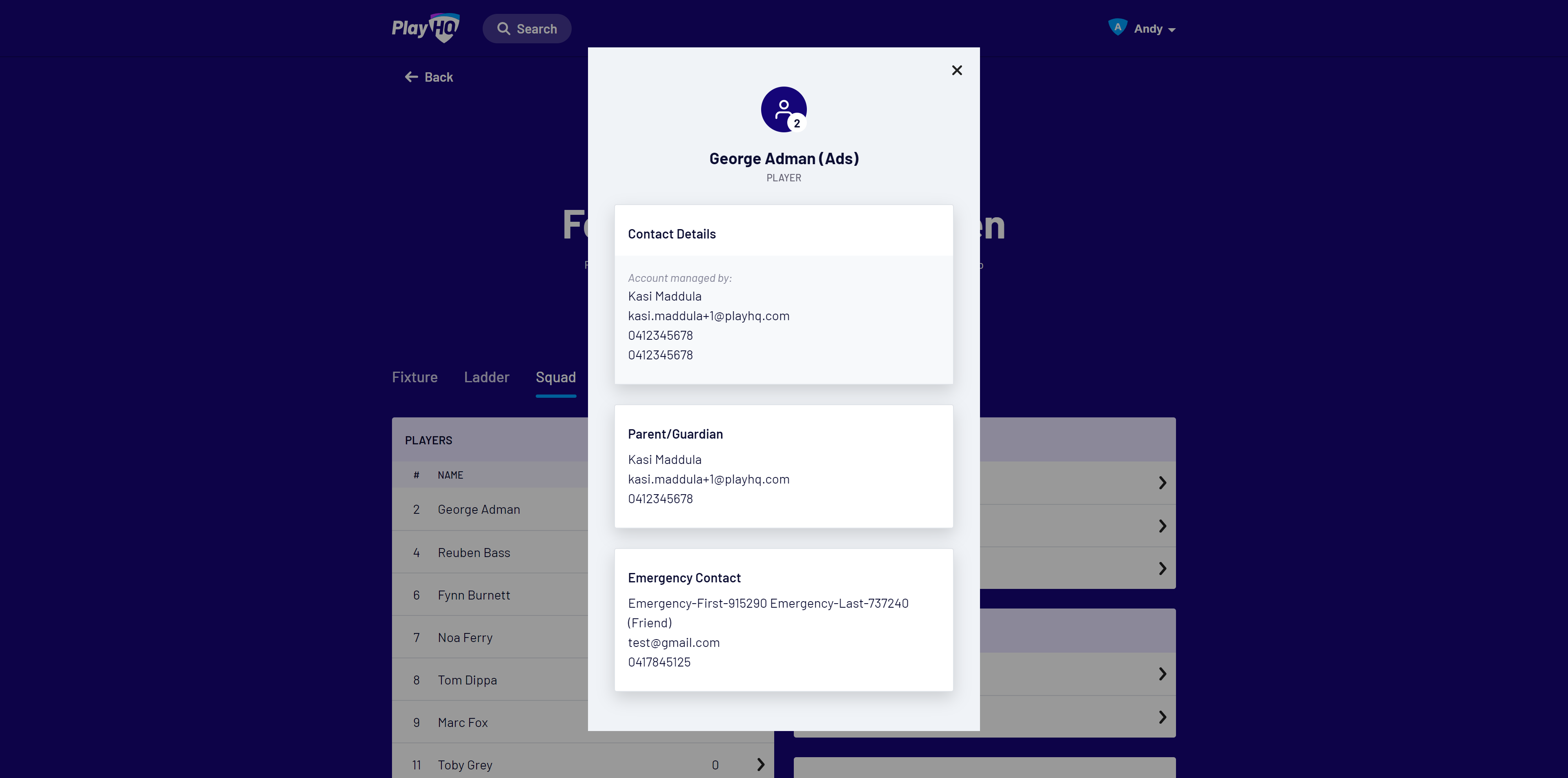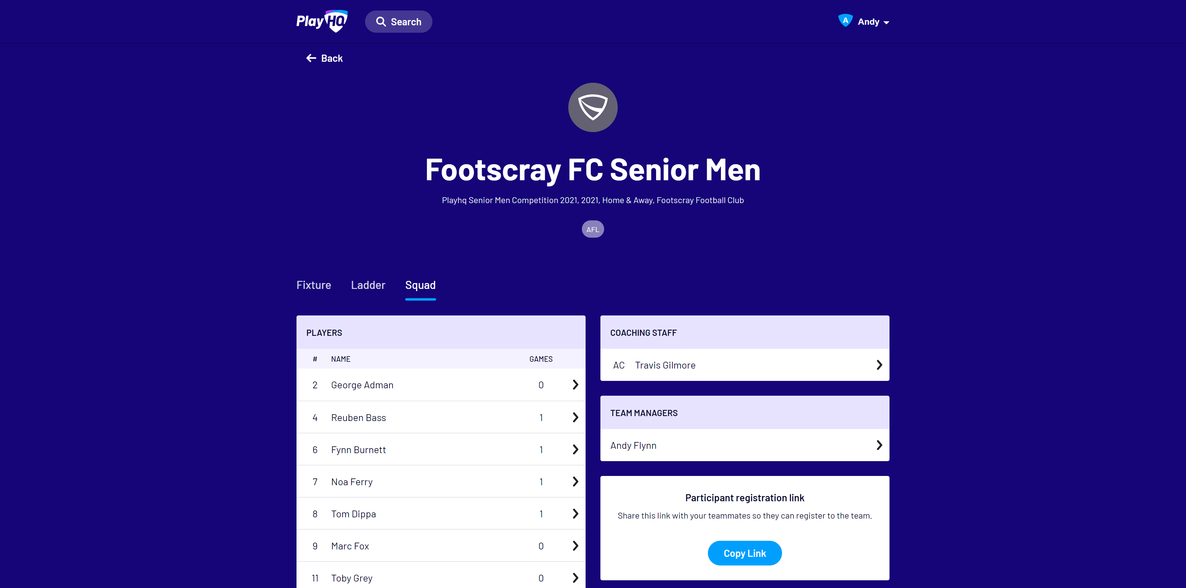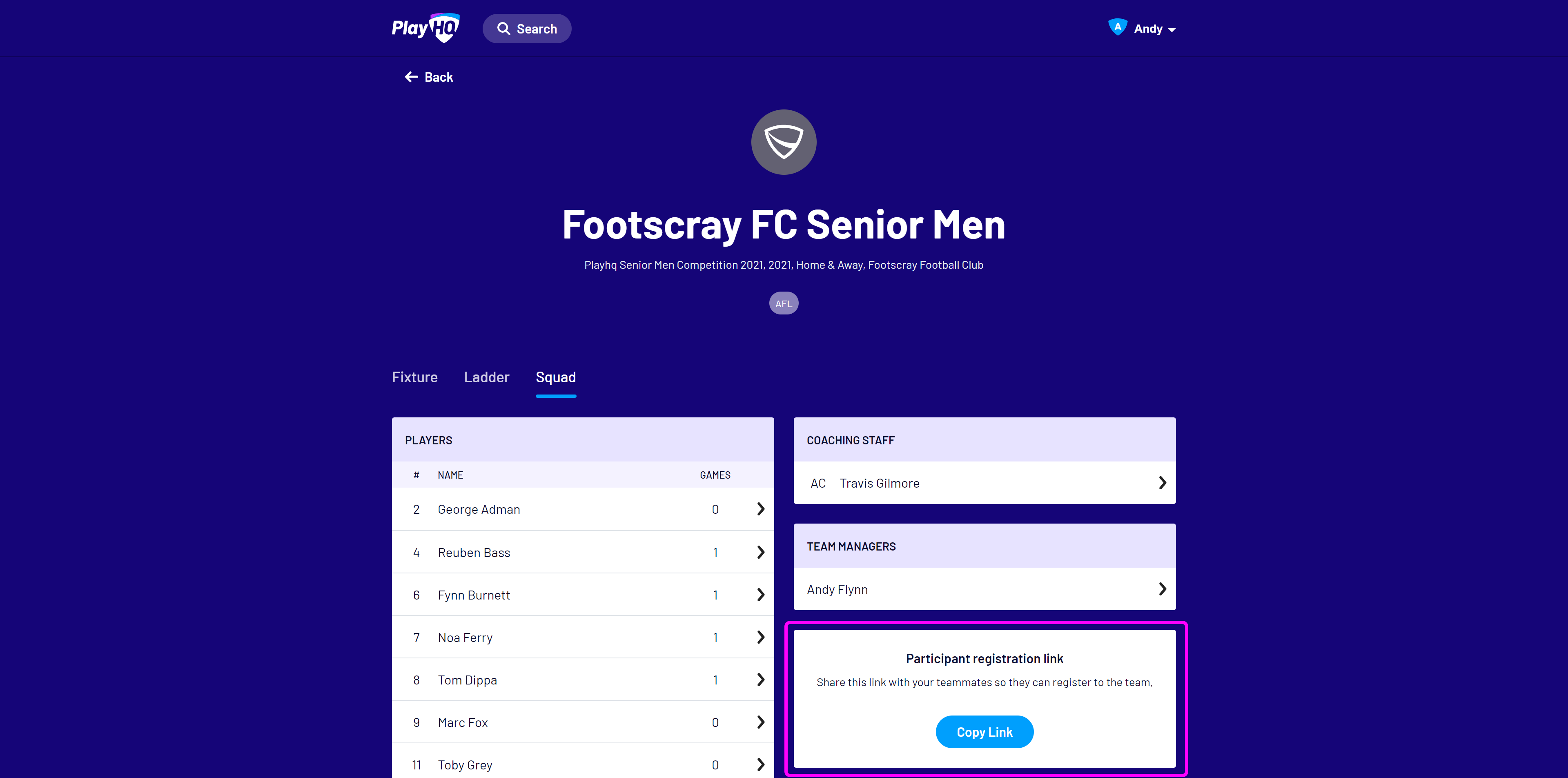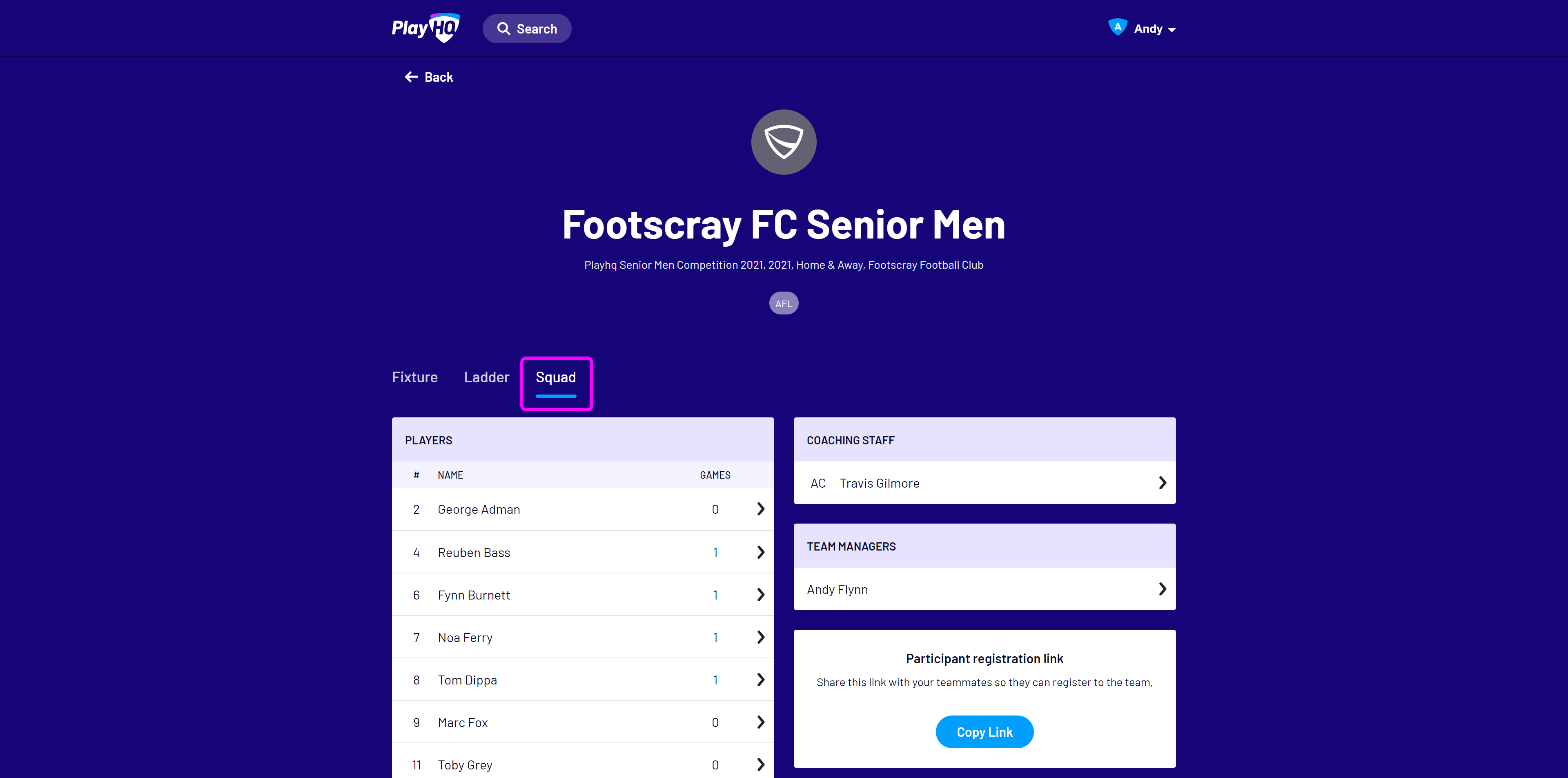 Team staff, if given management access by their club or association, can use the Squad view to view a participant profile, including contact details, parent or guardian information and emergency contact details. Staff can also quickly access a team registration link for any new players.