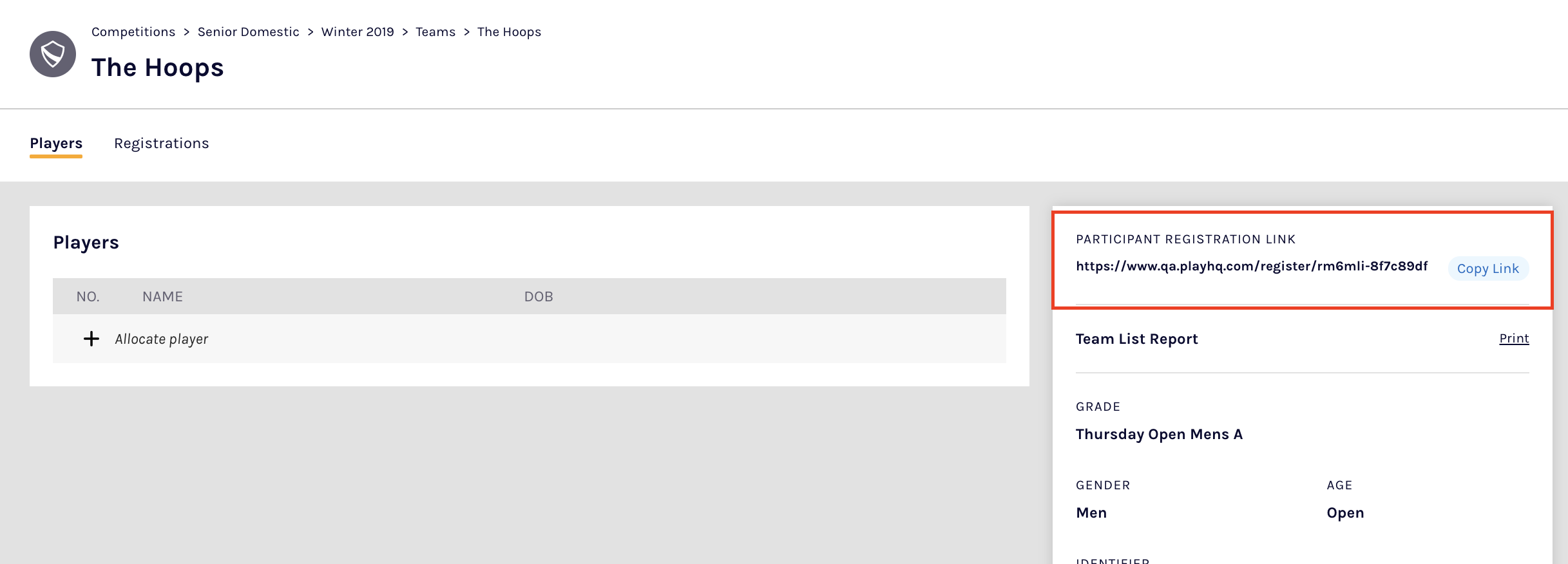 Once saved, a unique URL for each team is created. To access the unique link for a team, go to the Team Detail page of the team in the relevant competition season. This link can be distributed to any participants who need to register directly to that team.