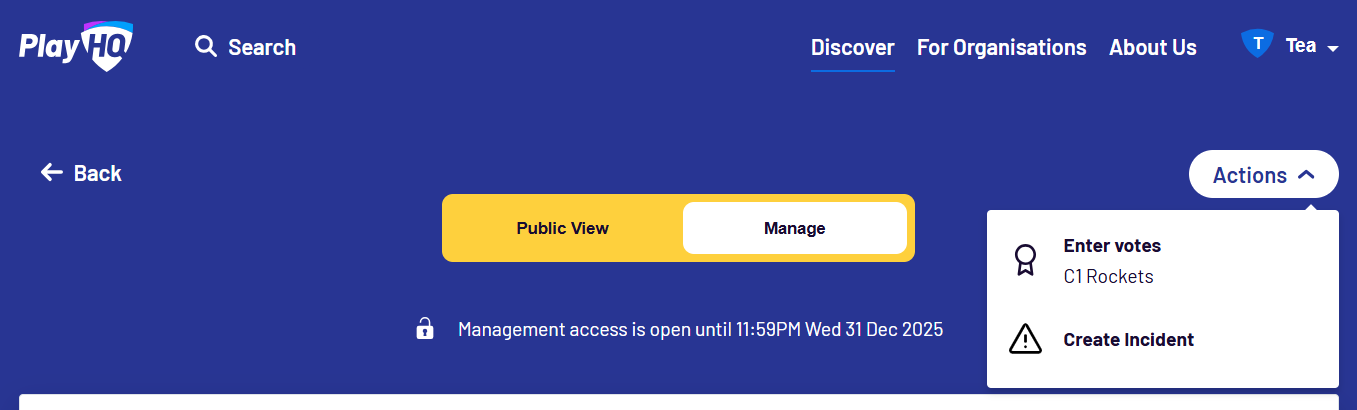 - As a Team Manager with Management Access, navigate to My Teams via playhq.com.