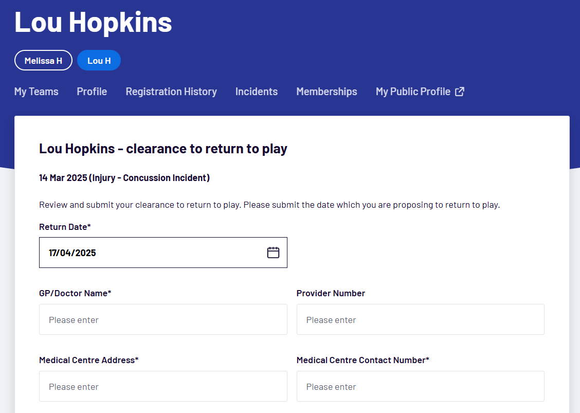 - Enter the proposed Return Date to return to play, provide your registered medical doctor / GP details, confirm compliance with the return to play steps, and click Submit Clearance.