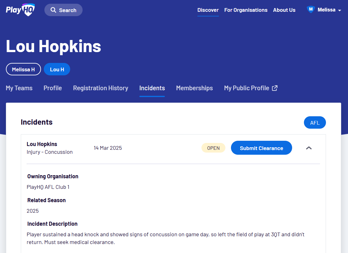 The player must login to playhq.com to submit a clearance to return to play request, via the Incidents tab in their Account details (PlayHQ Profile).