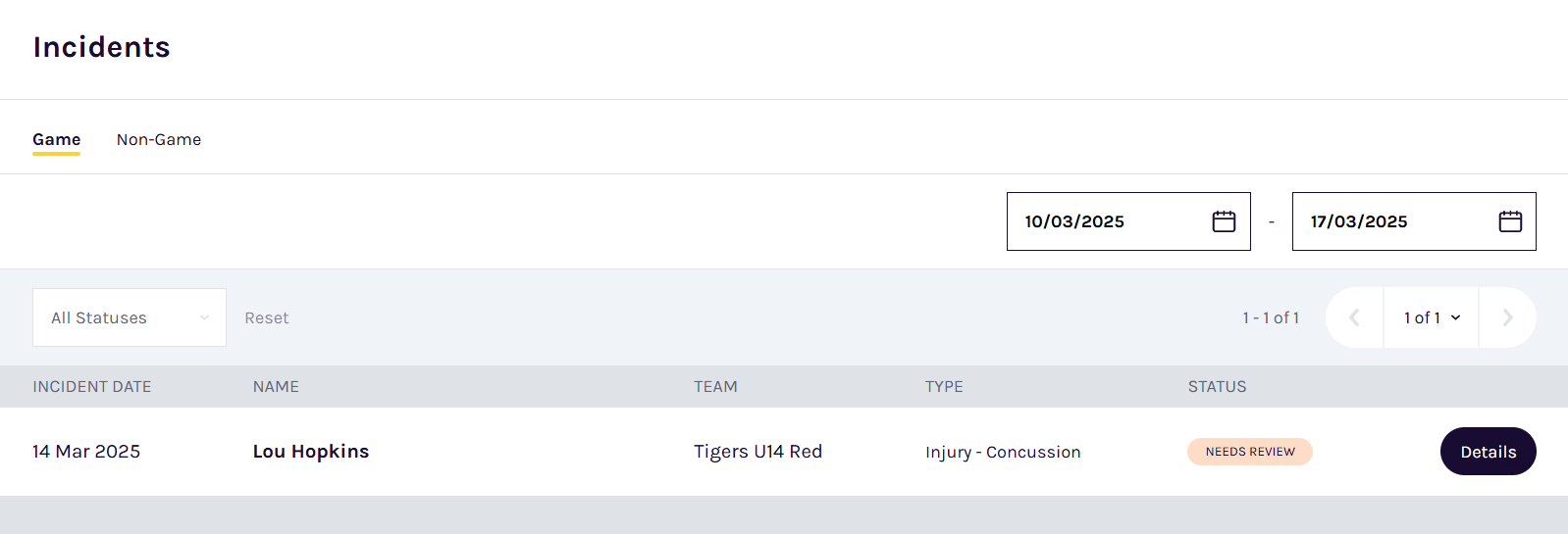 - Use the Date Range search to find the relevant player's concussion incident in either the Game or Non-Game tab, and click Details.