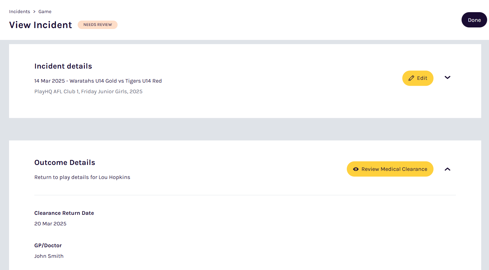 If the concussion status moves from OPEN to NEEDS REVIEW, then the player will remain ineligible for selection on a team sheet until a Team Manager or Club Administrator confirms via PlayHQ that they have sighted the medical clearance.