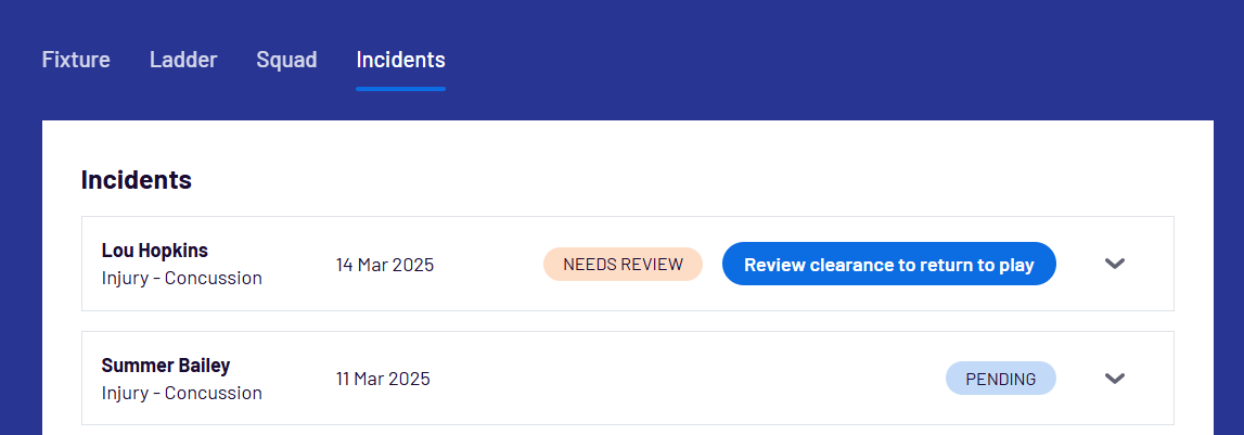 Team Managers and Club Administrators can view current concussion incidents via the Incidents list in the Admin Portal and My Teams.