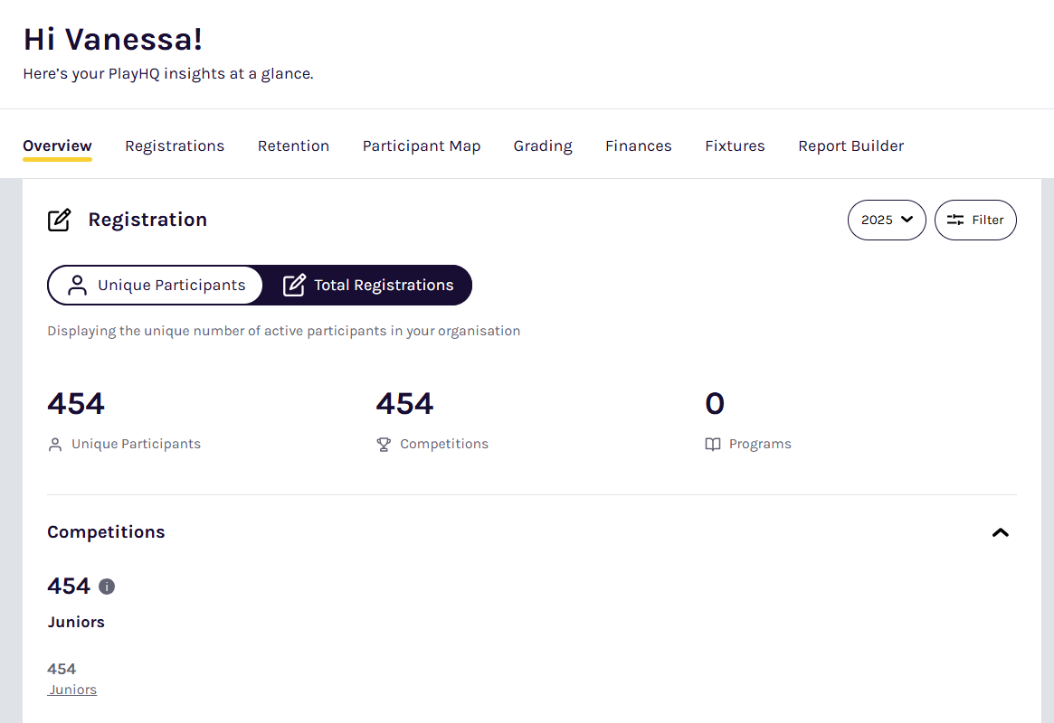 The Overview dashboard serves as your analytics homepage, providing an instant snapshot of the number of people registered to your organisation by season. When you first log into the Admin Portal, this is the first view you'll see in the Dashboard section.