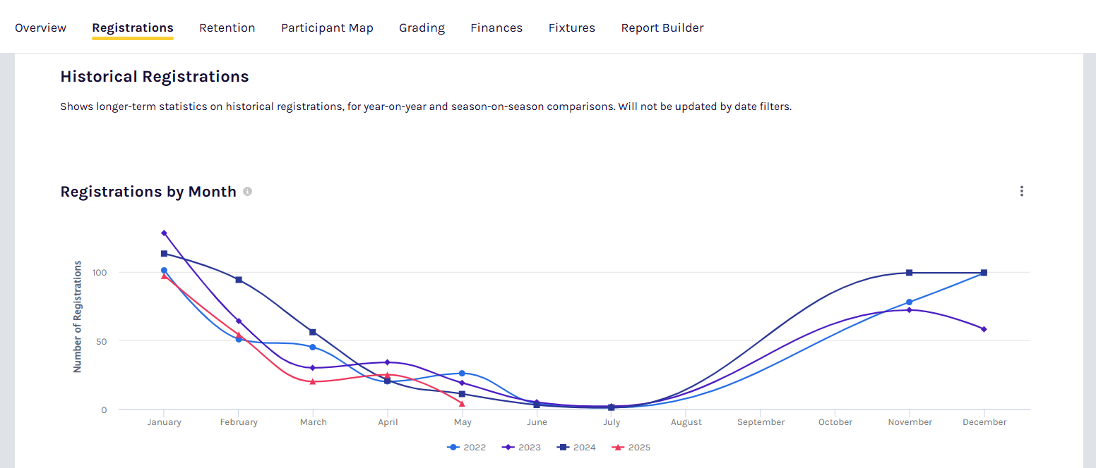 Insights from these dashboards could be most useful before planning for your next season (look at registrations trends), during key registration periods (retention data), before grading of teams occurs, and monthly for financial tracking.