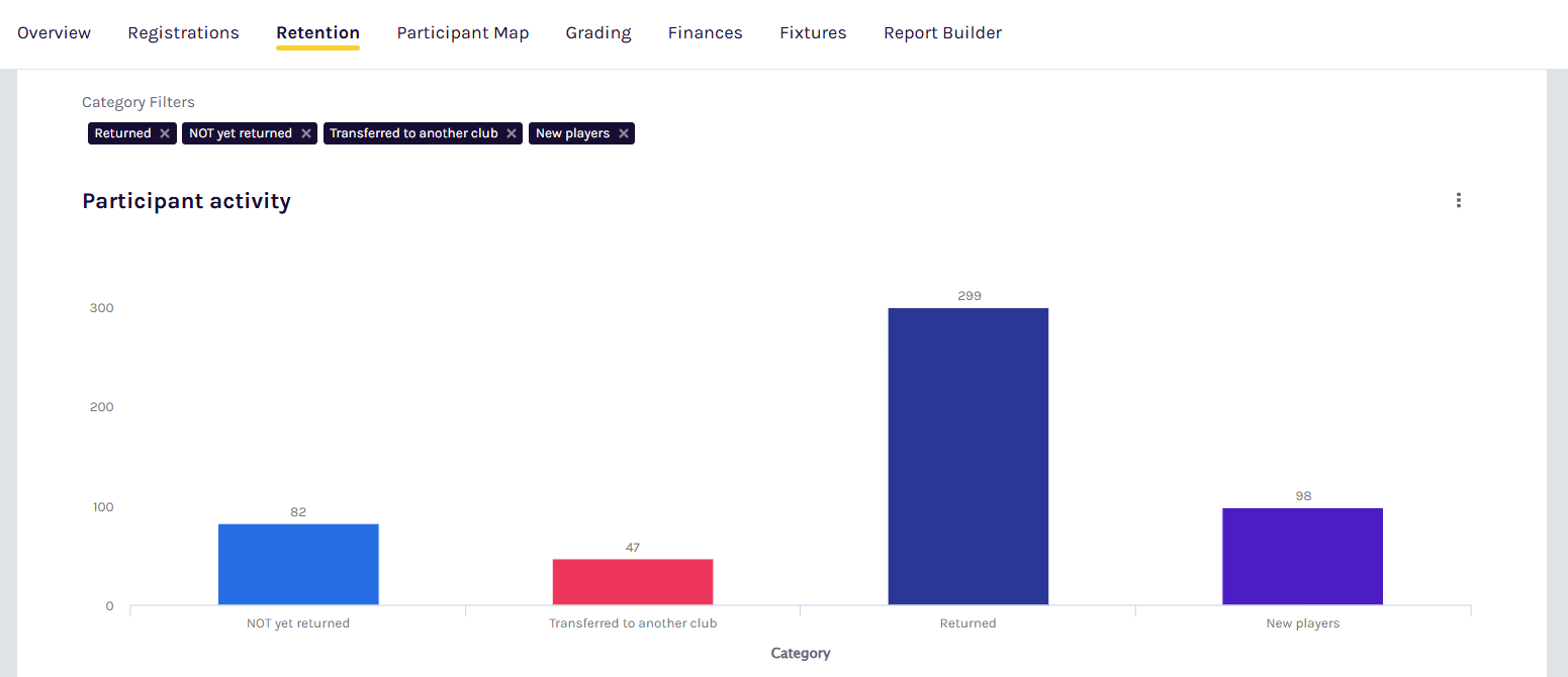 The Retention dashboard helps you identify players from last season who haven't yet signed up for the new season. It gives you a chance to reach out and encourage them to return before they decide to go elsewhere.