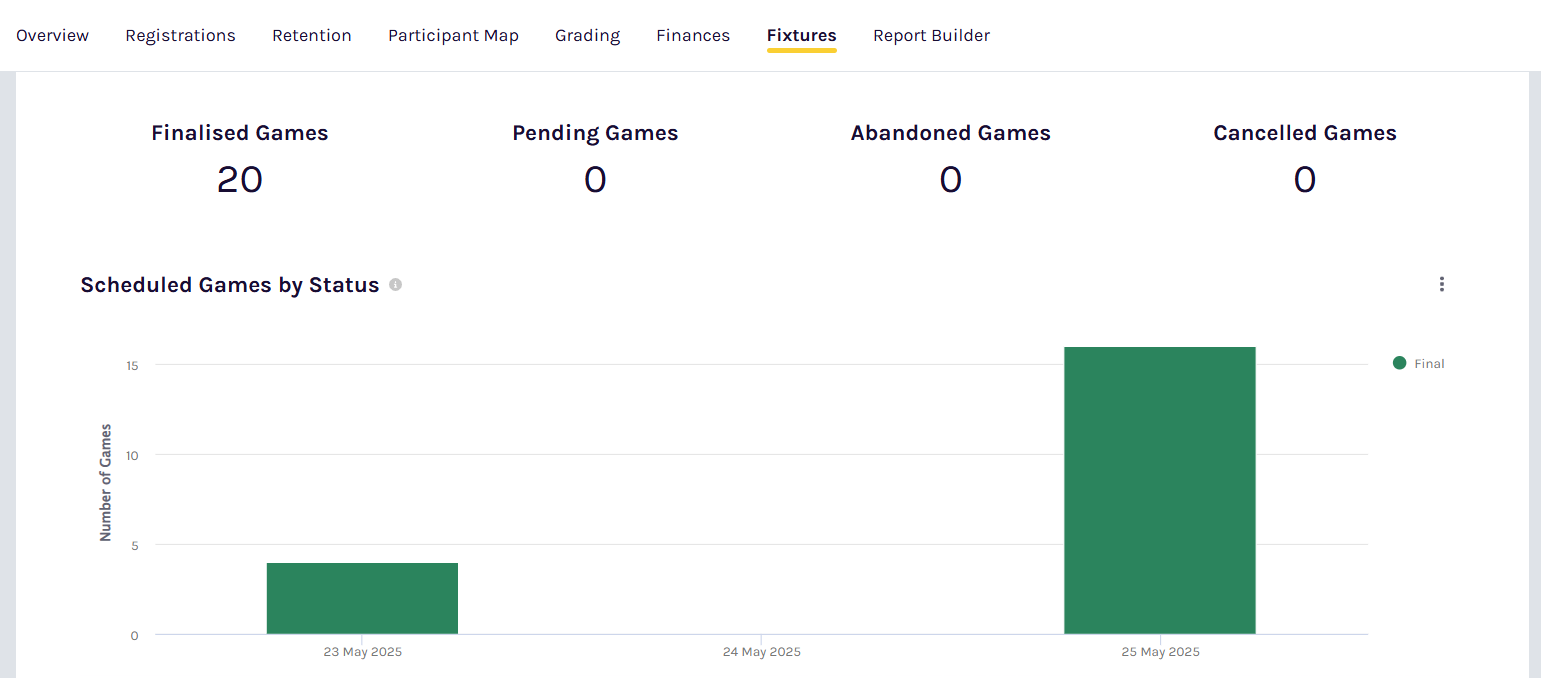 The Fixtures dashboard helps admins stay on top of game management by providing a clear overview of fixture statuses and upcoming games. This is particularly useful for identifying games that haven't been finalised and need administrative attention.