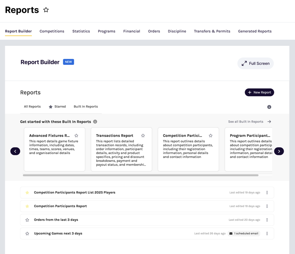 Each report focuses on one data set (like registrations or fixtures), but you can create multiple reports and combine them in your own presentations or documents.