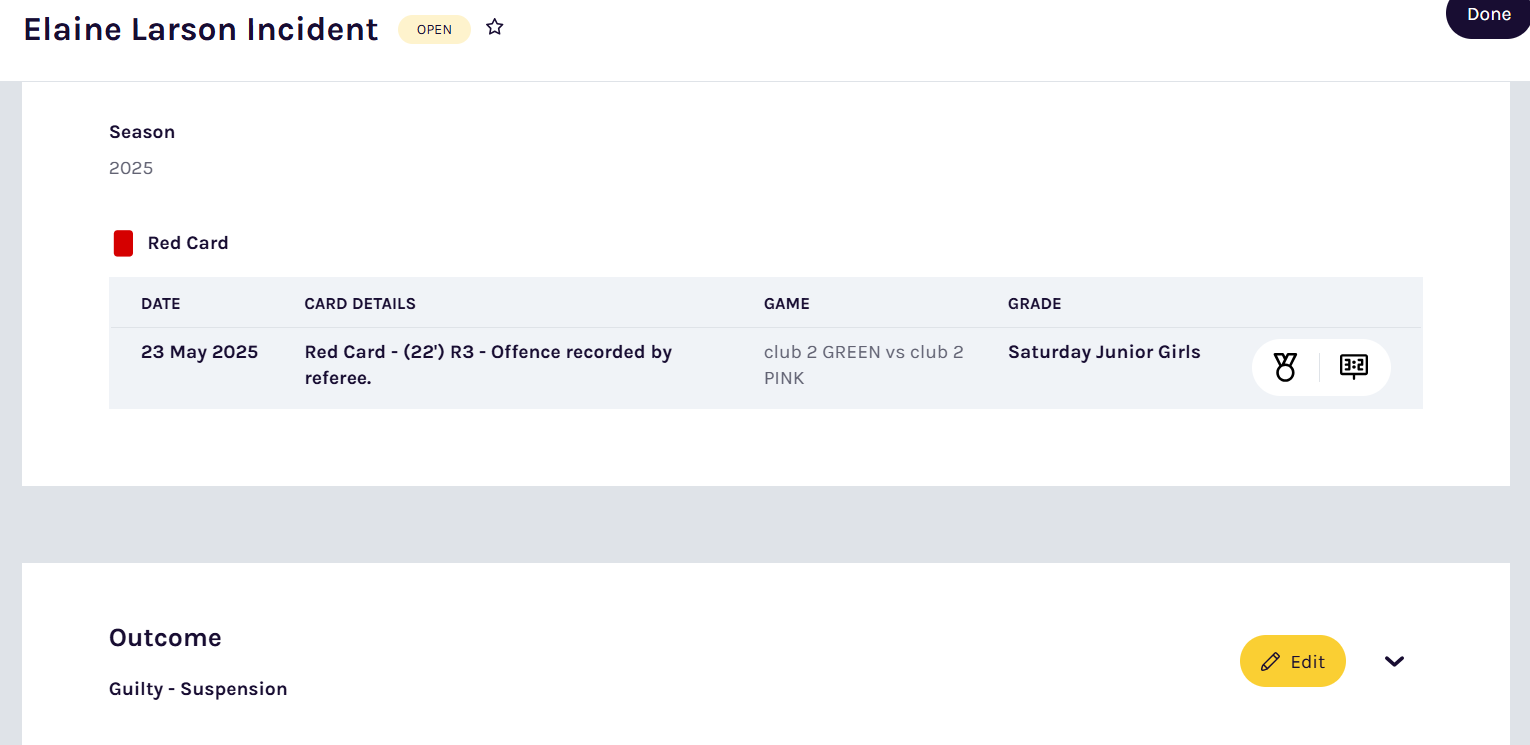 An incident will automatically be created after the red card entry is saved, along with the outcome of "Guilty - Suspension" for 1 week starting the day after the match.