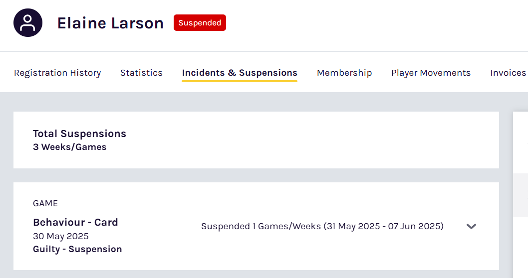 - On the Player's Profile - open the participant’s profile, and the incident and suspension status will be visible