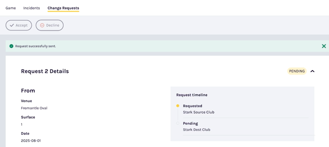 ⚠️ Important: Associations can override any club game change request. Both the initial request AND your approval must happen before the association's set timeframe (e.g. if set to 1 day, all activity must complete more than 1 day before game start).