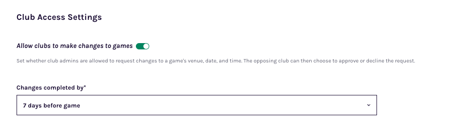 When enabled in grade settings, clubs can propose changes to game dates, times and venues, which the opposing club must approve. This feature is disabled by default across all competition types but can be activated anytime through a competition's grade settings.