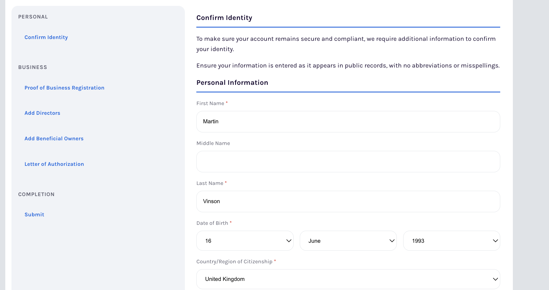 Ensure all information matches your official organisation documents exactly. Incorrect details will delay your payment setup.