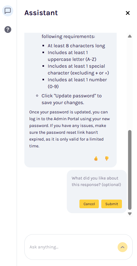 There is an option to leave feedback on the response provided by the Assistant. This will allow the Assistant to improve response accuracy.