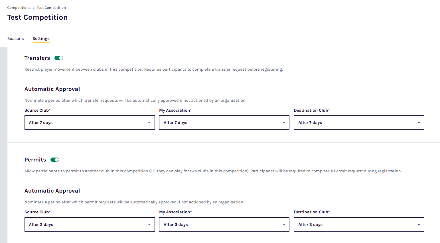 - Select the automatic approval window, after 1-10 days, after which permit requests will be automatically approved if not actioned by the organisation (source club, association, or destination club)