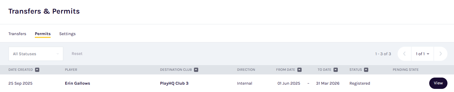 To approve or decline a season permit request, navigate to your organisation’s Transfers & Permits request list and switch to the Permits tab. Select View next to the season permit requiring your organisation’s approval.